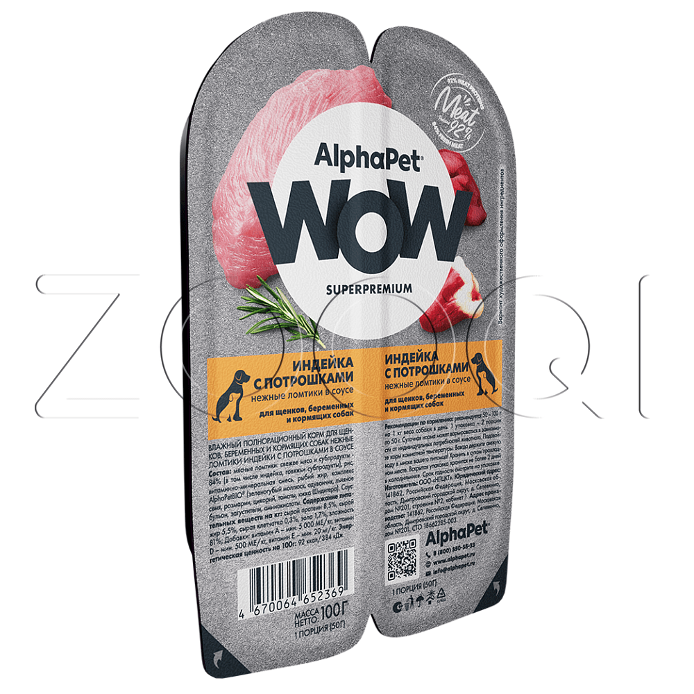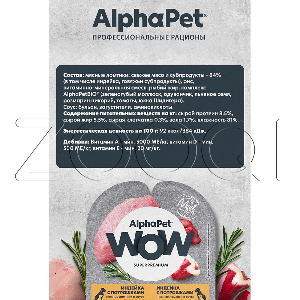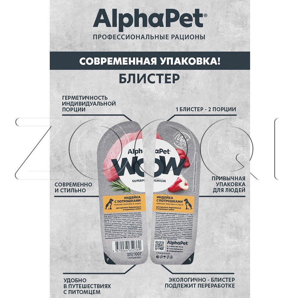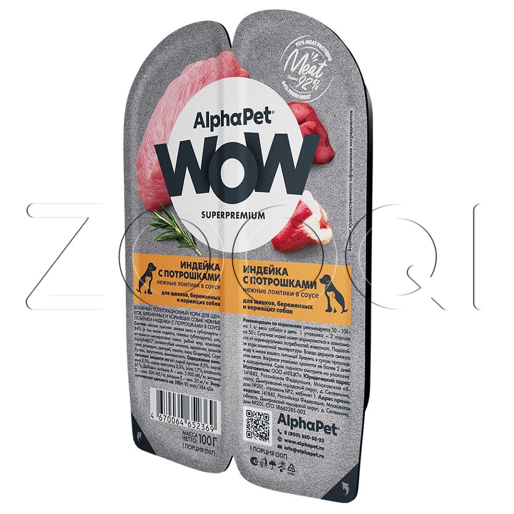 AlphaPet WOW Superpremium – влажный полнорационный корм для щенков, беременных и кормящих собак нежные ломтики индейки с потрошками в соусе.