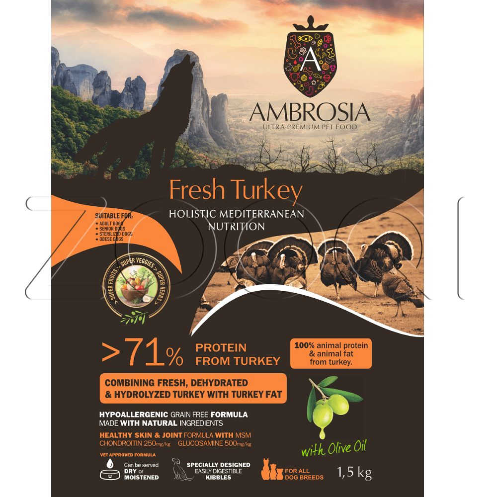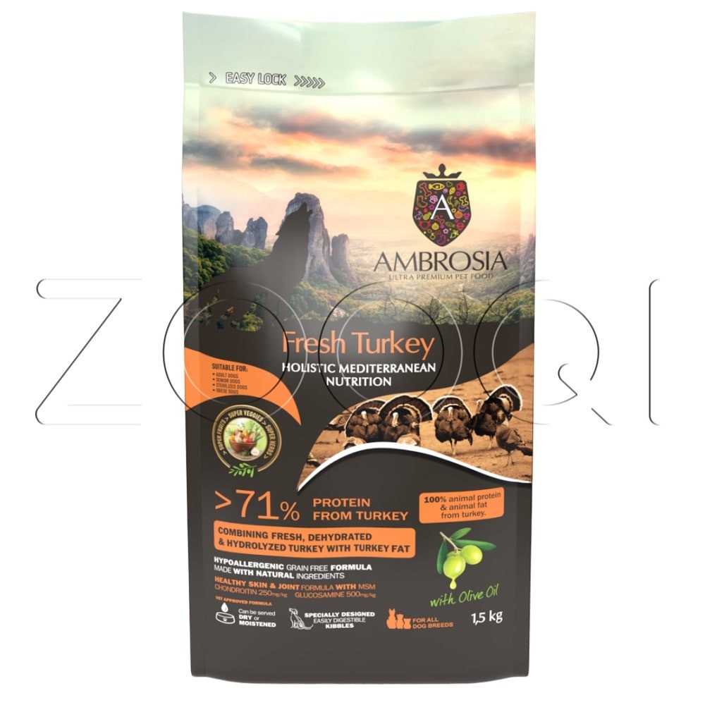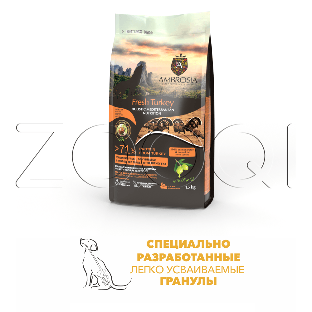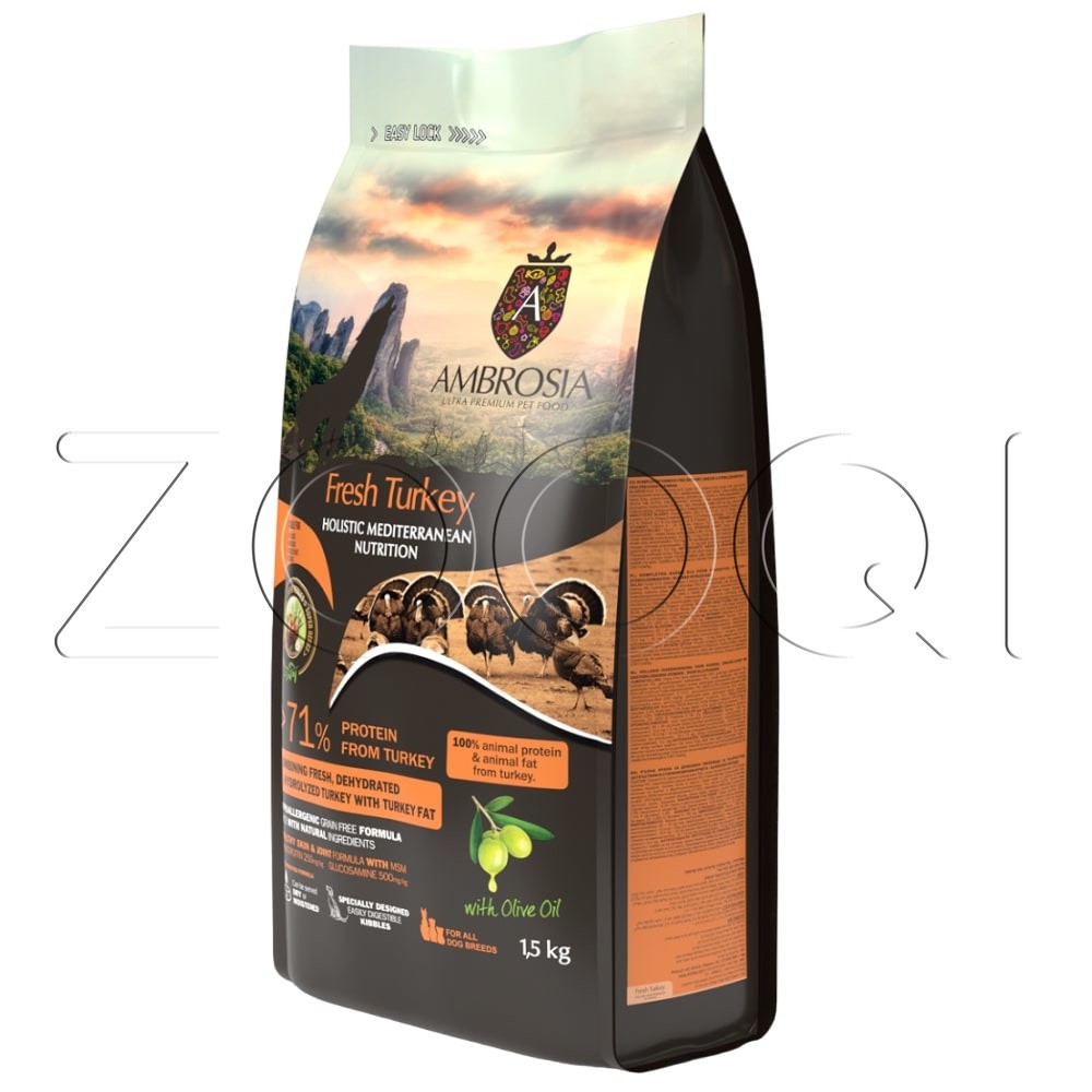 Рецепт Ambrosia Fresh Turkey сочетает в себе высококачественный и в то же время нежирный белок, поступающий из свежего филе индейки. Корм содержит достаточное количетсво оливкового масла и смесь средиземноморских фруктов и трав. Гипоаллергенный, беззерновой, содержит антиоксиданты, подходящие для собак всех пород.