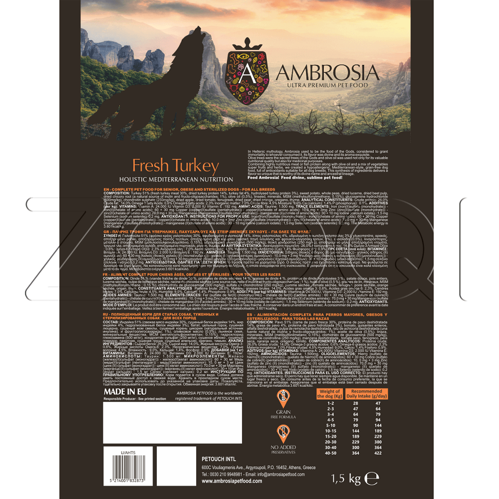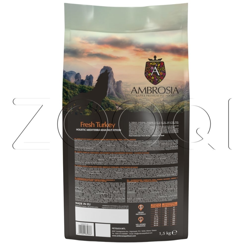 Ambrosia Mediterranean Diet Grain Fresh Turkey Adult, Senior, Obese & Sterilized Dogs All Breeds — монопротеиновый сухой корм из свежей индейки для взрослых, пожилых, страдающих ожирением и стерилизованных собак.