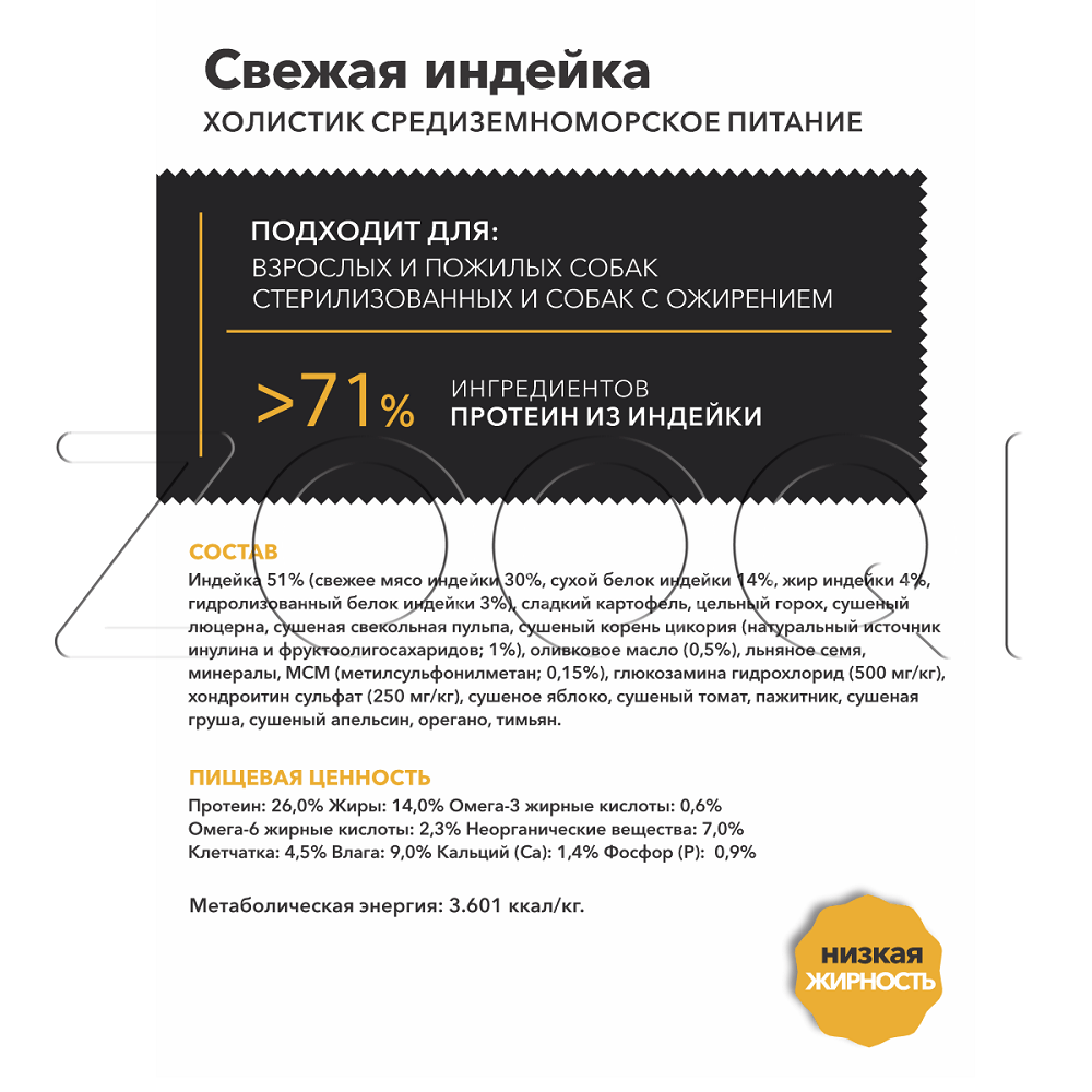 Индейка 51% (свежее мясо индейки 30%, сушеный белок индейки 14%, жир индейки 4%, гидролизованный белок индейки 3%), сладкий картофель (батат), цельный горох, сушеная люцерна, сушеный свекольный жом, сушеный корень цикория (природный источник инулина) и фруктоолигосахариды; 1%), оливковое масло (0,5%), льняное семя, минеральные вещества, МСМ (метилсульфонилметан; 0,15%), глюкозамина гидрохлорид (500мг/кг), хондроитин сульфат (250мг/кг), сушеное яблоко , сушеный помидор, пажитник, сушеная груша, сушеный апельсин, орегано, тимьян.