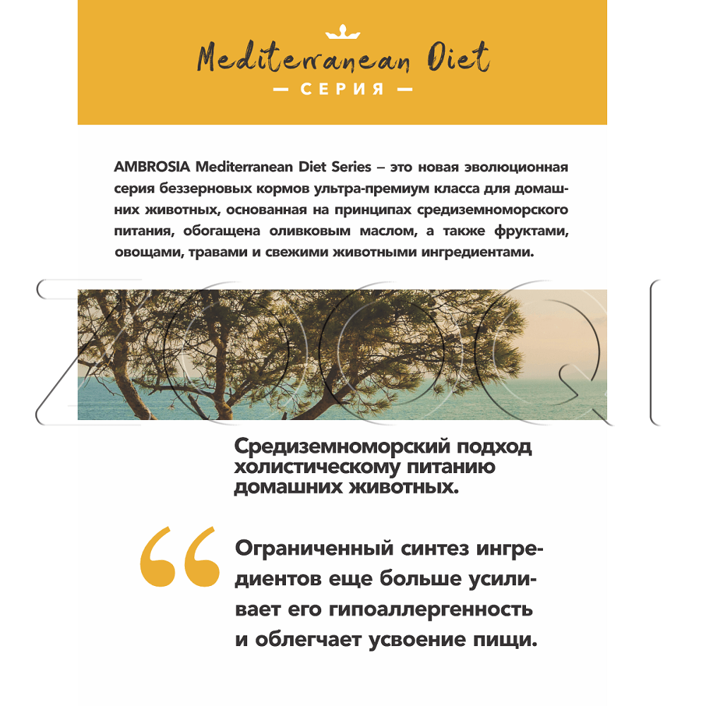 Ambrosia Mediterranean Diet Series — новая эволюционная серия беззерновых кормов для домашних животных ультра-премиум-класса, основанная на принципах средиземноморского питания, обогащена оливковым маслом, а также фруктами, овощами, травами и свежими животными ингредиентами.