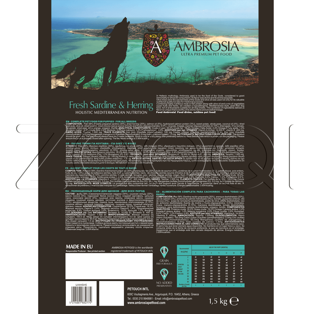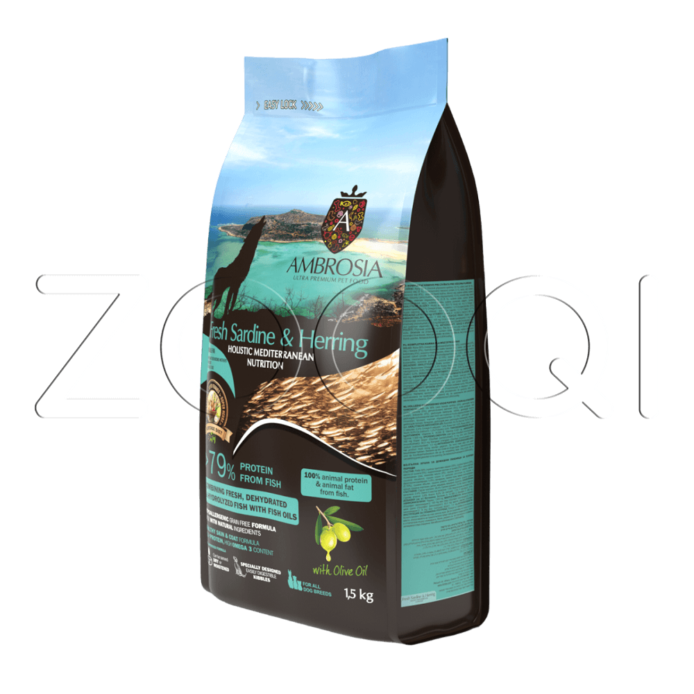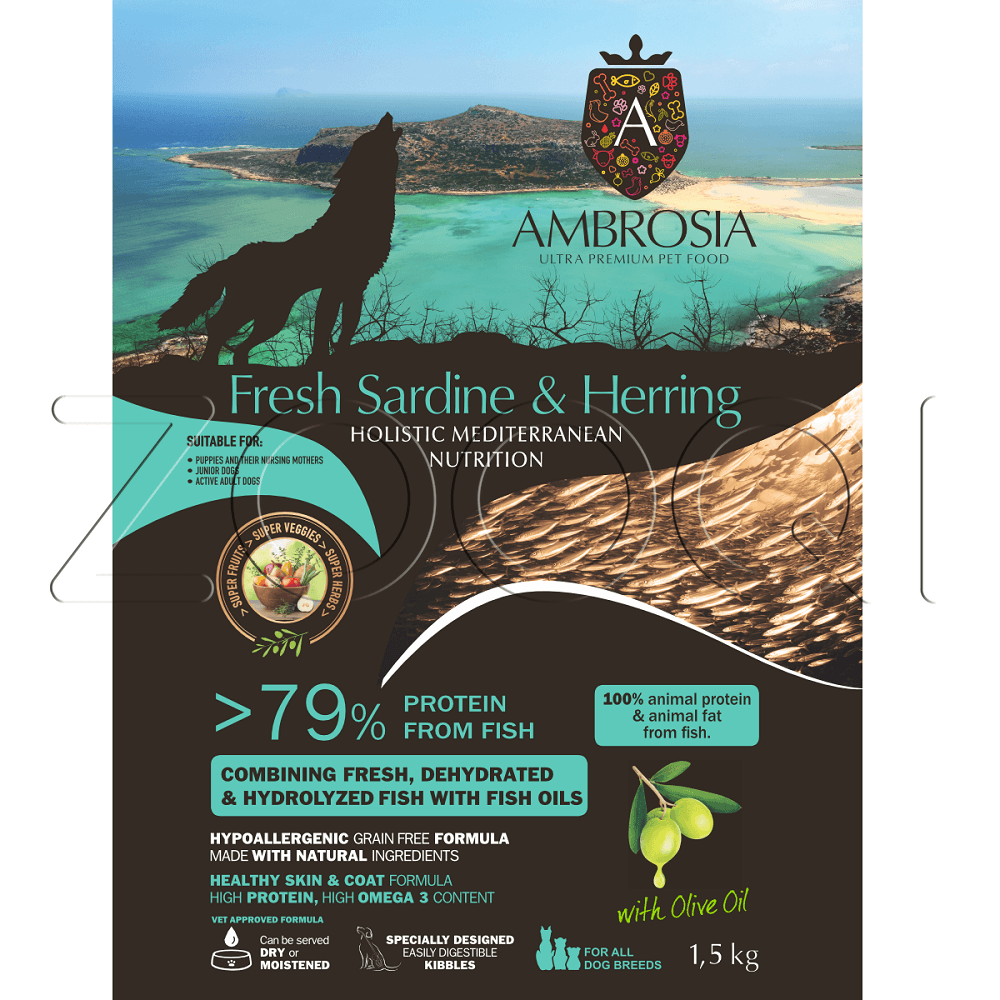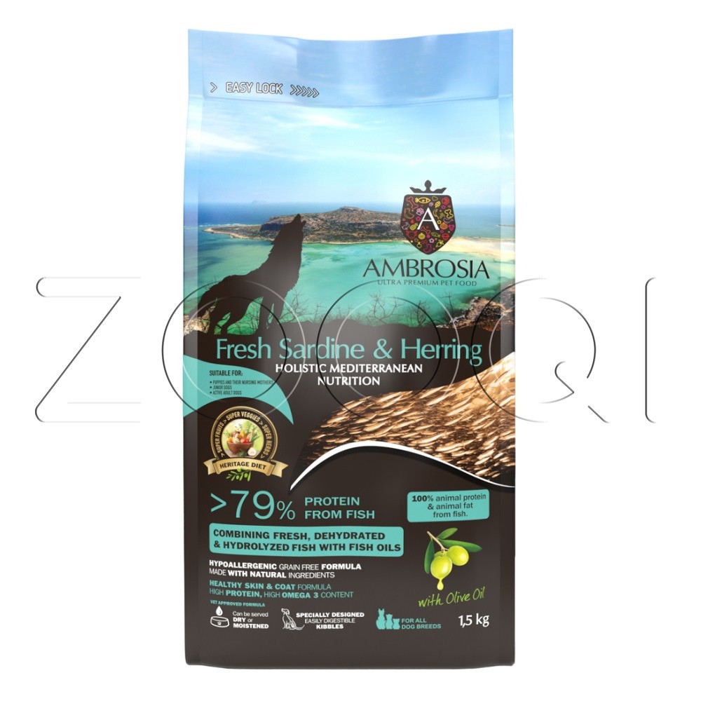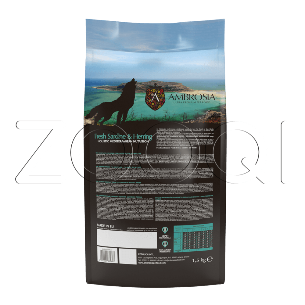 Ambrosia Mediterranean Diet Grain Free Fresh Sardine & Herring Puppy & Growth All Breeds — монопротеиновый сухой корм из свежих сардин и сельди для щенков и молодых собак, а также для кормящих сук и взрослых собак с повышенной активностью.