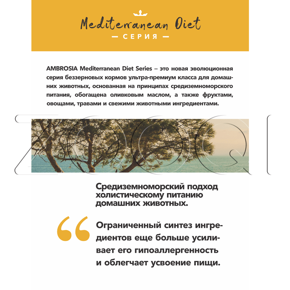 Ambrosia Mediterranean Diet Series — новая эволюционная серия беззерновых кормов для домашних животных ультра-премиум-класса, основанная на принципах средиземноморского питания, обогащена оливковым маслом, а также фруктами, овощами, травами и свежими животными ингредиентами.