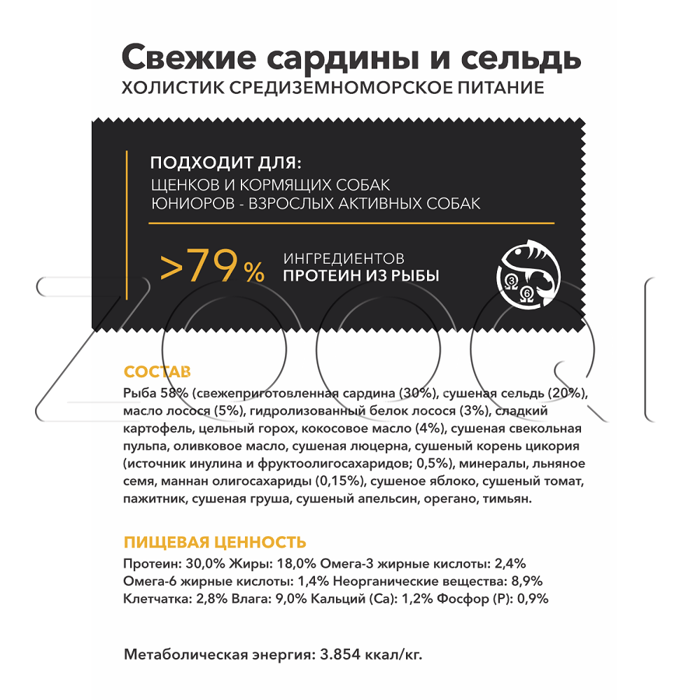 Рыба 58% (свежеприготовленная сардина (30%), сушеная сельдь (20%), лососевое масло (5%), гидролизат белка лосося (3%), сладкий картофель, цельный горох, кокосовое масло (4%), сушеный жом свеклы, оливковое масло, сушеная люцерна, высушенный корень цикория (источник инулина и фруктоолигосахарида 0,5%); минеральные вещества, льняное семя, маннан олигосахариды (0,15%), сушеное яблоко, сушеные помидоры, пажитник, сушеная груша, сушеный апельсин, орегано, тимьян.