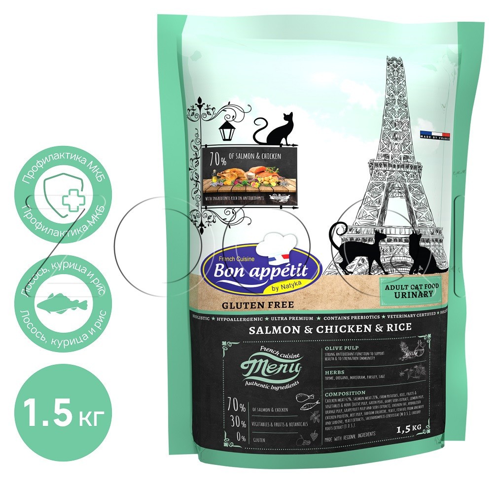 Bon Appetit Сat Adult Urinary — полнорационный гипоаллергенный корм без глютена с лососью и курицей для взрослых кошек при мочекаменной болезни.