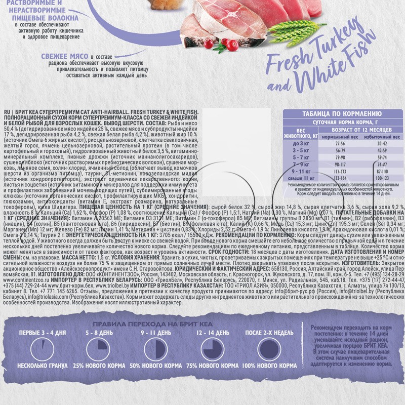 Брит Кеа Anti-Hairball — полнорационный сухой корм супер премиум-класса с белой рыбой и индейкой для взрослых кошек. Вывод шерсти. Естественный для кошки процесс вылизывания приводит к образованию комочков шерсти в желудке. В результате могут наблюдаться рвота и расстройство пищеварения.
