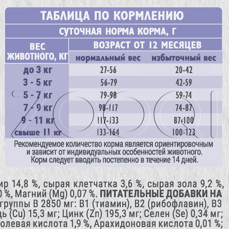 Сырой белок 32 %, сырой жир 14,8 %, сырая клетчатка 3,6 %, сырая зола 9,2 %, влажность 8 %, Кальций (Са) 1,62 %, Фосфор (Р) 1,08 %, соотношение Кальций (Са) / Фосфор (Р) 1,5:1, Натрий (Na) 0,30 %, Магний (Mg) 0,07 %.