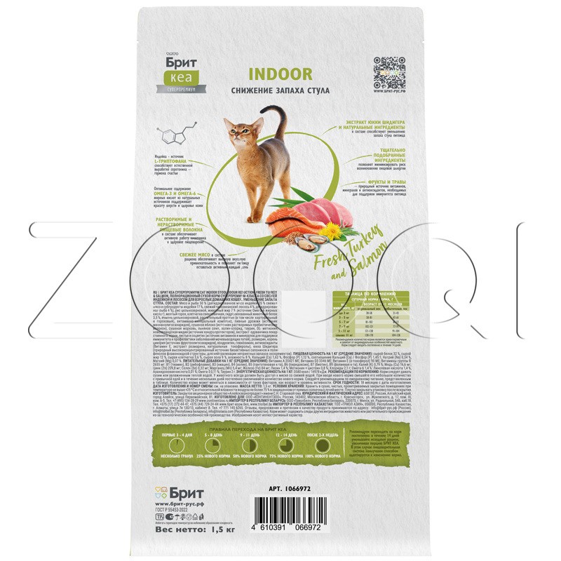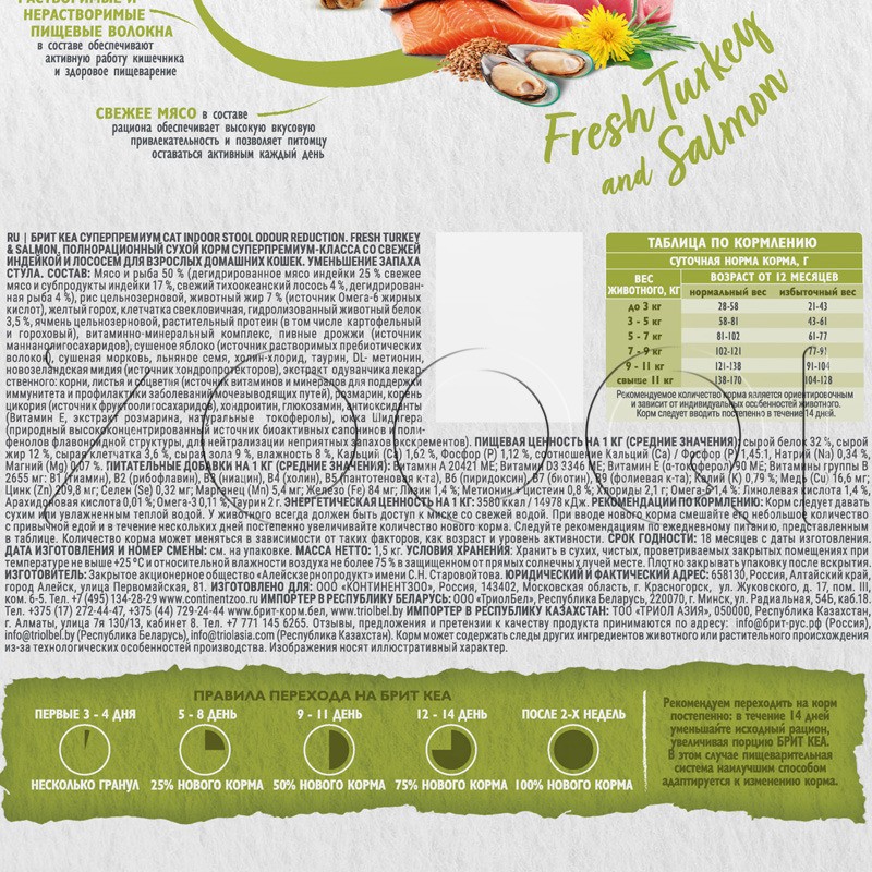Брит Кеа Indoor Stool Odour Reduction — полнорационный сухой корм суперпремиум-класса с индейкой и лососем предназначен для взрослых кошек, живущих в помещении. Он помогает уменьшить неприятный запах стула, что особенно актуально для кошек, у которых запах из лотка сильнее, чем у других. Это способствует улучшению гигиены в доме и комфортному пребыванию питомца.