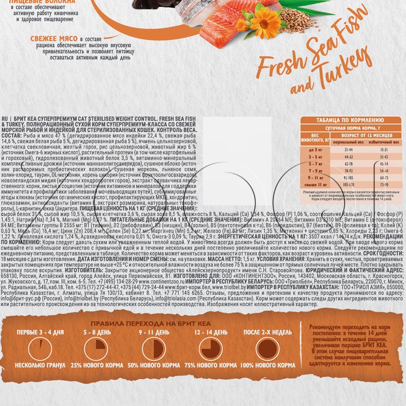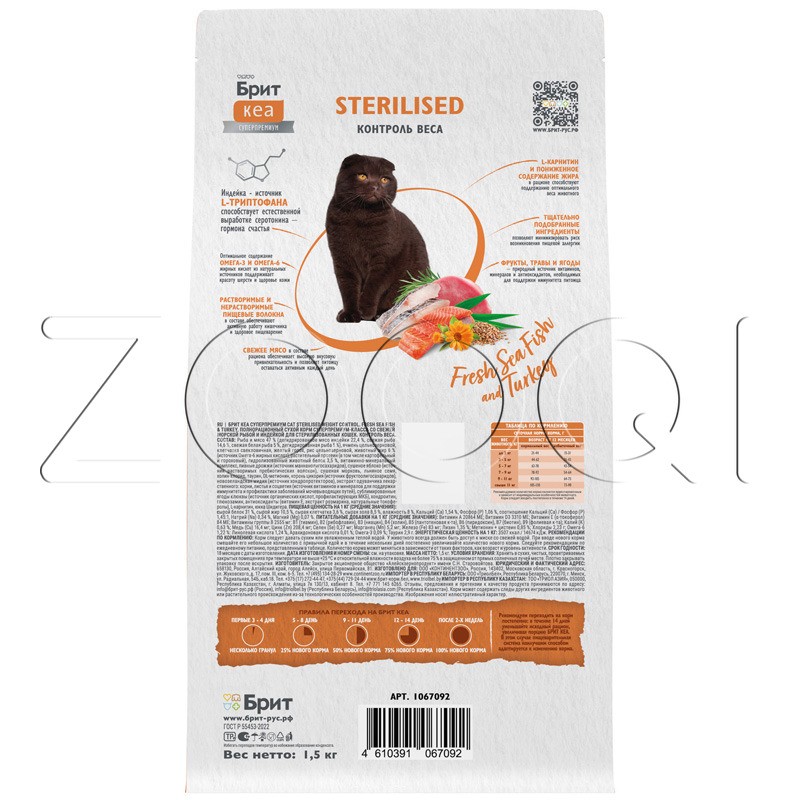 Брит Кеа Sterilised Weight Control — полнорационный сухой корм суперпремиум-класса с морской рыбой и индейкой для стерилизованных кошек. Контроль веса. Стерилизованные кошки могут набирать вес из-за снижения активности. Это приводит к болезням сердца, печени и почек.
