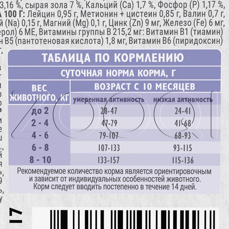 Сырой белок 28 %, сырой жир 15 %, влажность 8 %, сырая клетчатка 3,16 %, сырая зола 7 %, Кальций (Ca) 1,7 %, Фосфор (P) 1,17 %, соотношение Кальций (Ca) / Фосфор (P) 1,45.
