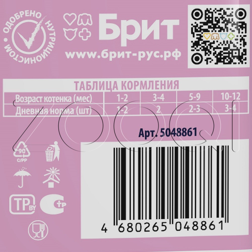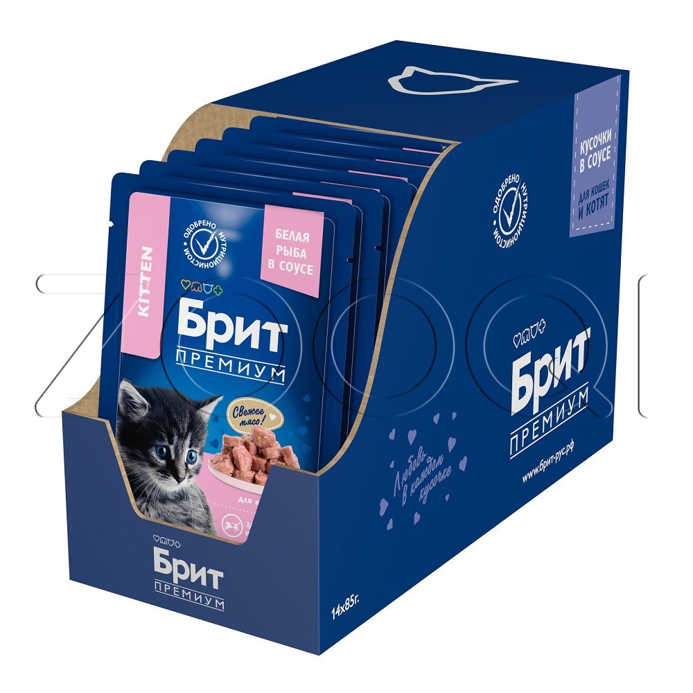 Брит Премиум Cat with White Fish Chunks for Kitten — полнорационный влажный корм премиум-класса для котят со вкусом белой рыбы в соусе.