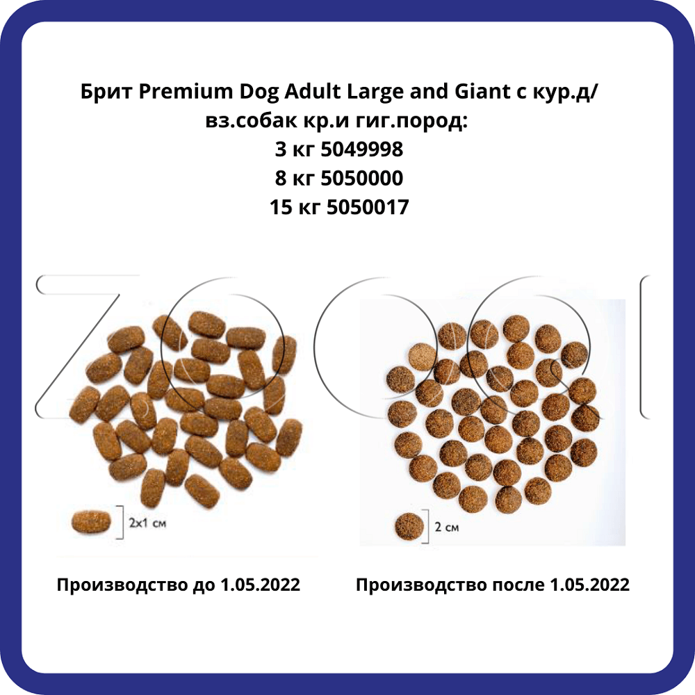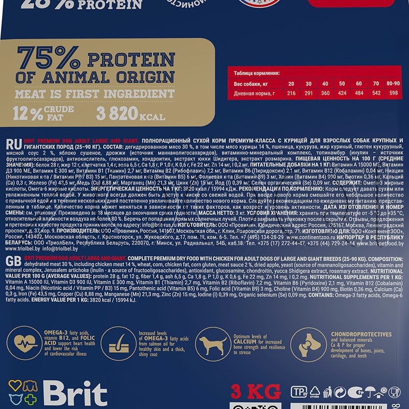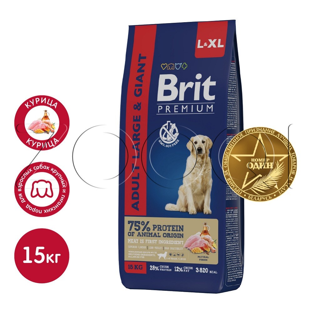 Brit Premium Dog Adult Large and Giant — полнорационный сухой корм с курицей для взрослых собак крупных пород и гигантских пород (25 – 90 кг).