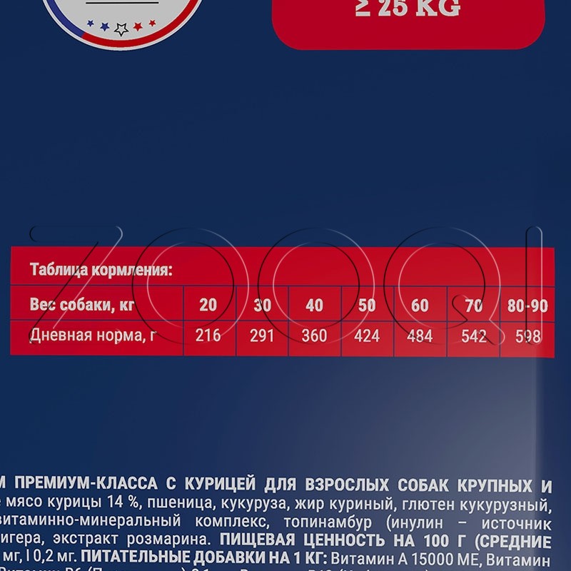 Состав: дегидрированное мясо 30 %, в том числе мясо курицы 14 %, пшеница, кукуруза, жир куриный, глютен кукурузный, мясной соус 2 %, яблоко сушеное, дрожжи (источник маннанолигосахаридов), витаминно-минеральный комплекс, топинамбур (инулин - источник фруктоолигосахаридов), антиокислитель, глюкозамин, хондроитин, экстракт юкки Шидигера, экстракт розмарина.