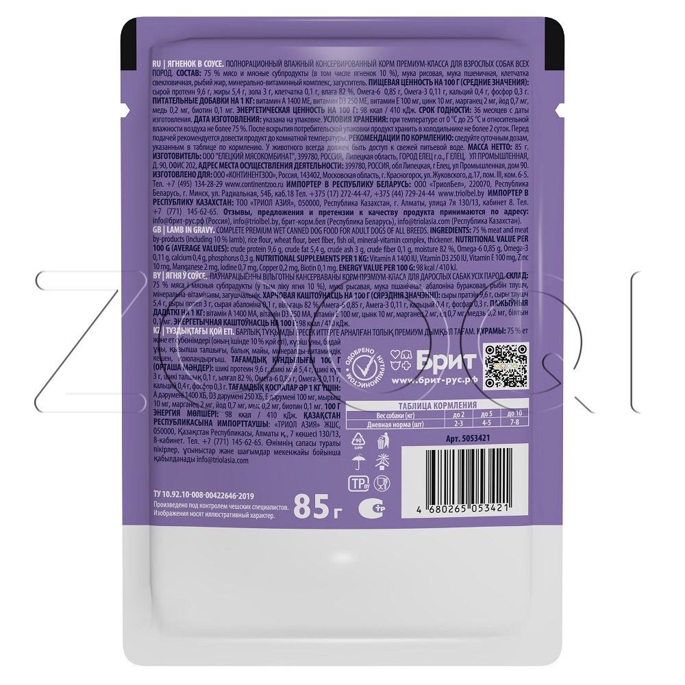 Влажный корм премиального качества содержит 75 % свежего мяса и все необходимые витамины и минералы для ежедневного рациона. Паучи отлично дополнят полнорационный сухой корм Brit Premium и внесут разнообразие в питание Вашего питомца.