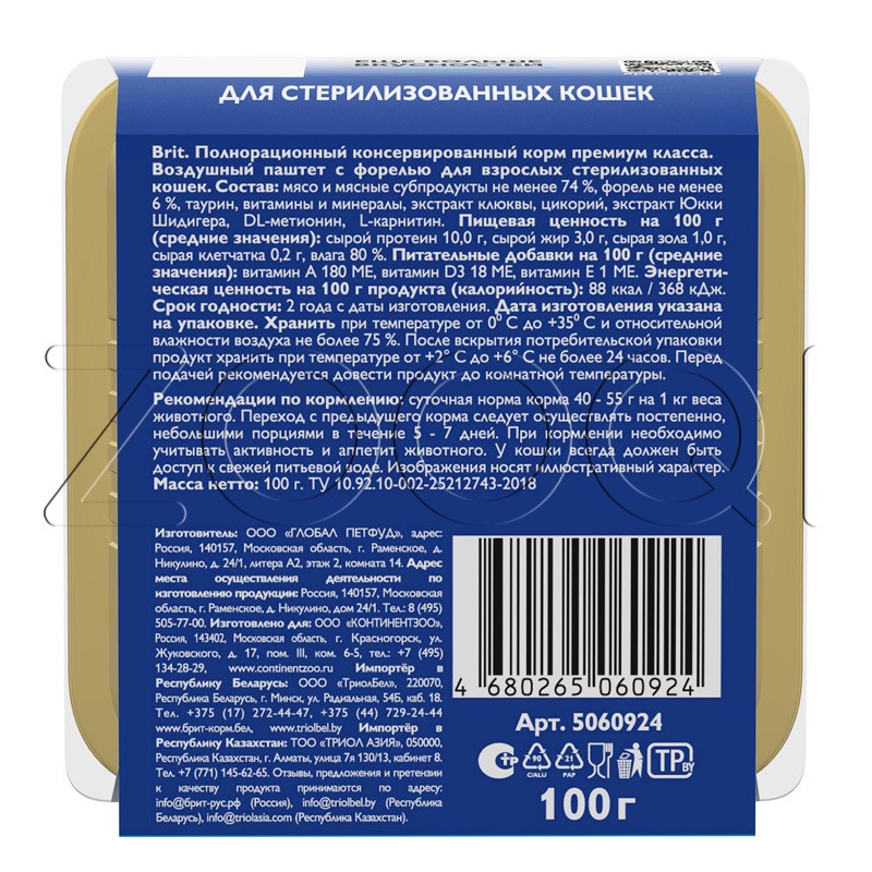 Брит Премиум Adult Sterilised with Trout — полнорационный консервированный корм премиум класса с форелью взрослых стерилизованных кошек.