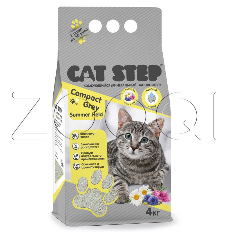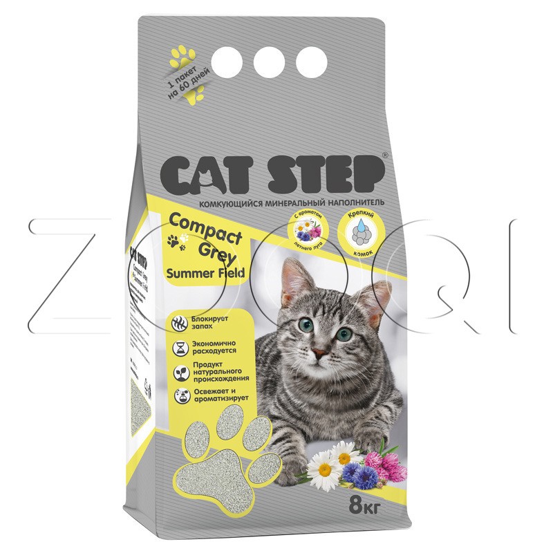 Cat Step Compact Gray Summer Field – серый комкующийся минеральный наполнитель для кошачьего туалета.
