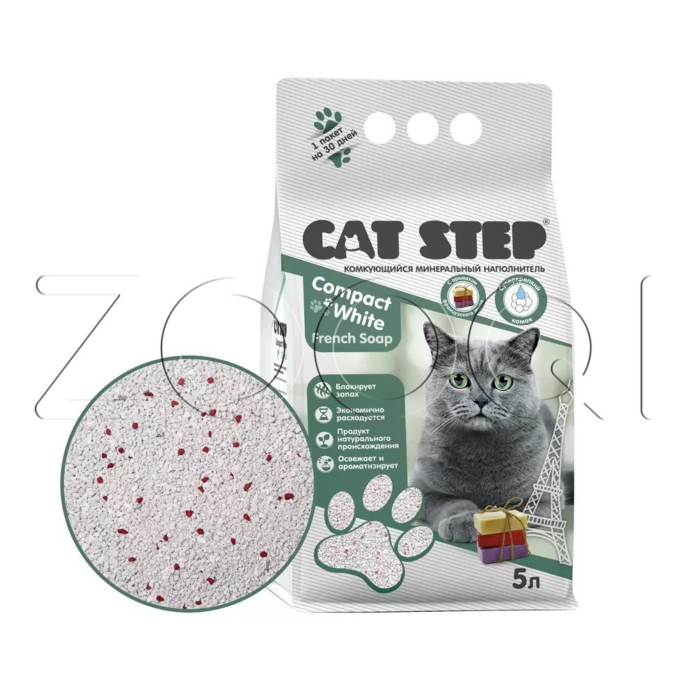 Cat Step Compact White French Soap — комкующийся минеральный наполнитель с ароматом марсельского мыла для кошачьих туалетов.