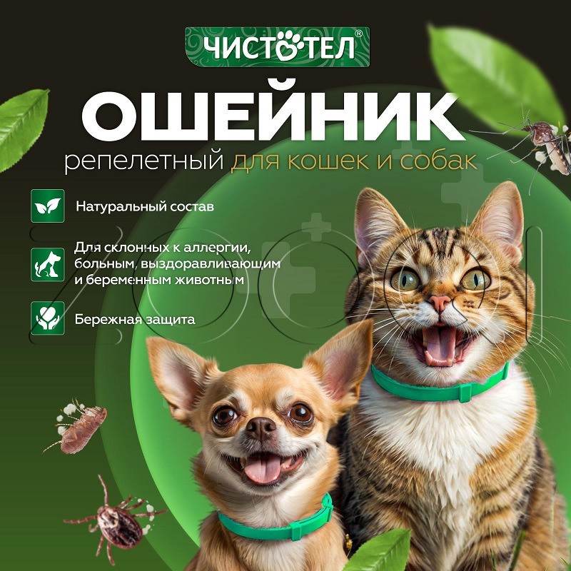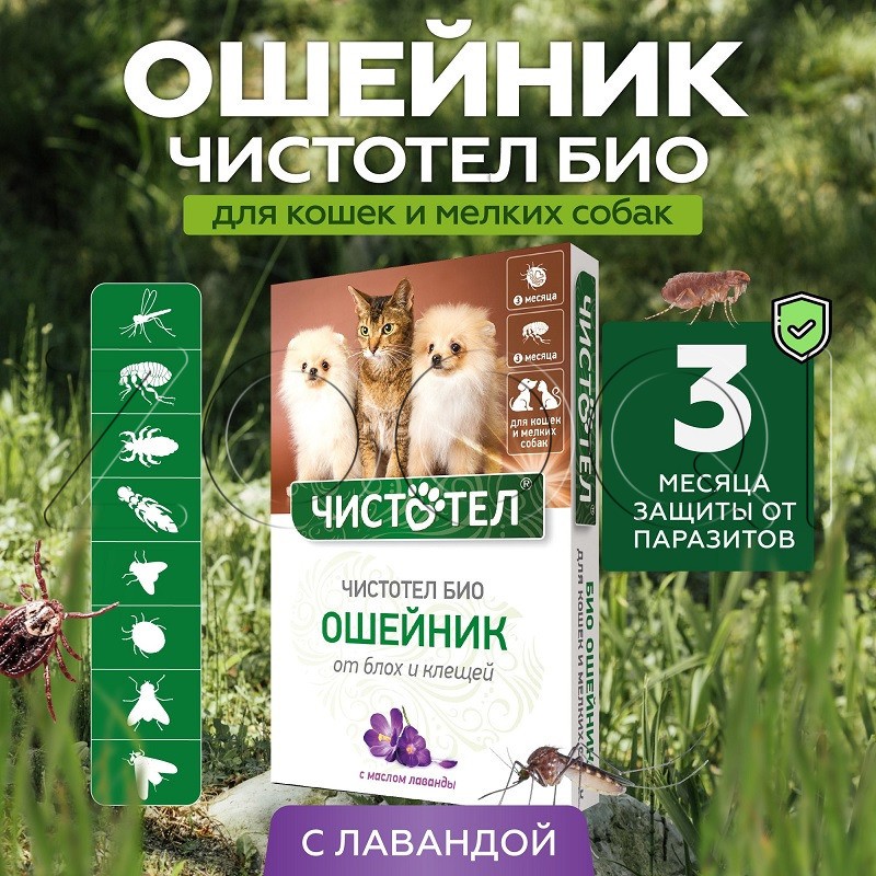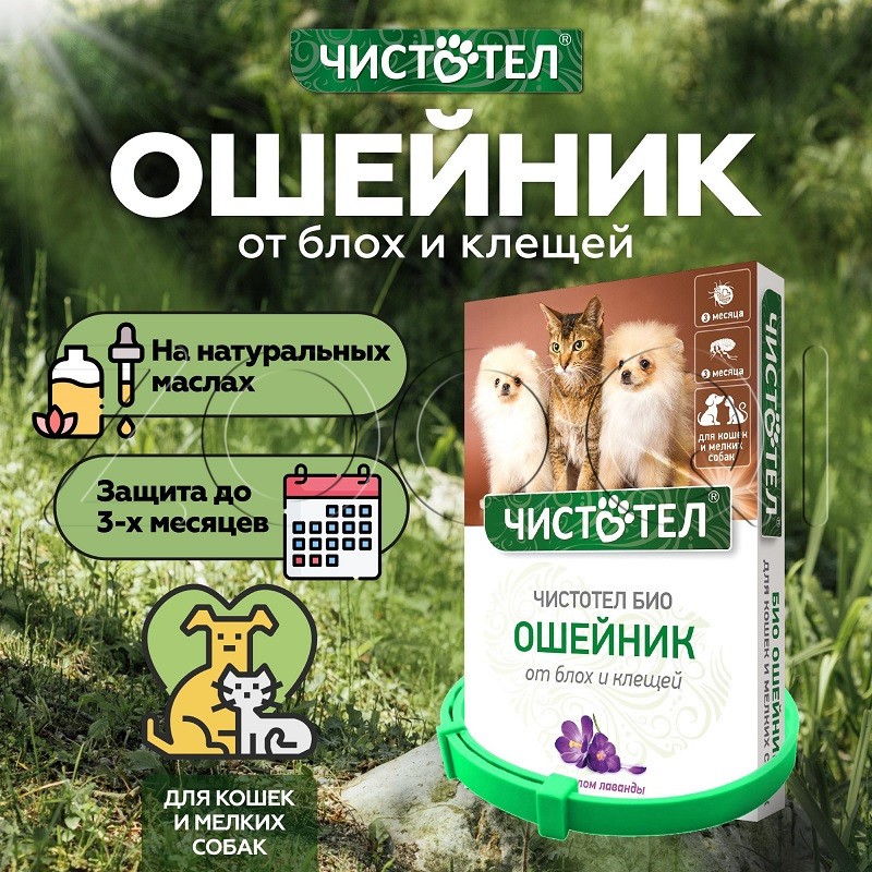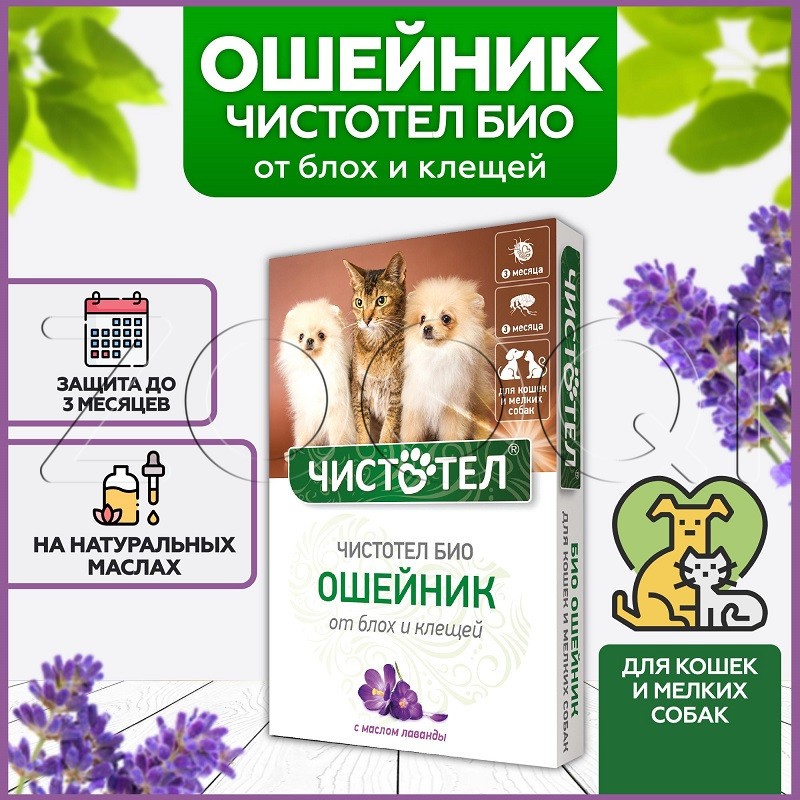 Чистотел Био Ошейник предназначен для применения взрослым кошкам и собакам, котятам и щенкам с 4-недельного возраста для защиты от эктопаразитов (блохи, вши, власоеды, комары, мухи, слепни, иксодовые клещи).