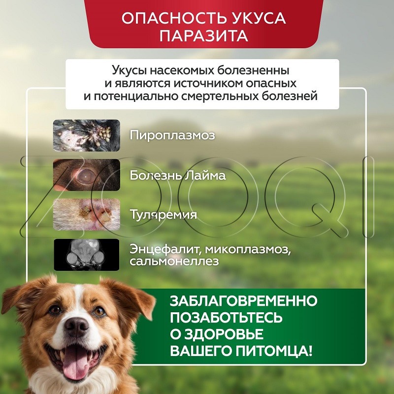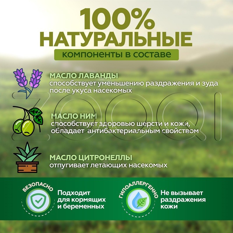 Отпугивает иксодовых клещей, блох, вшей и комаров до 3-х месяцев