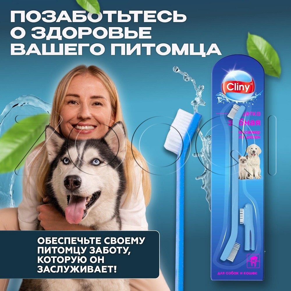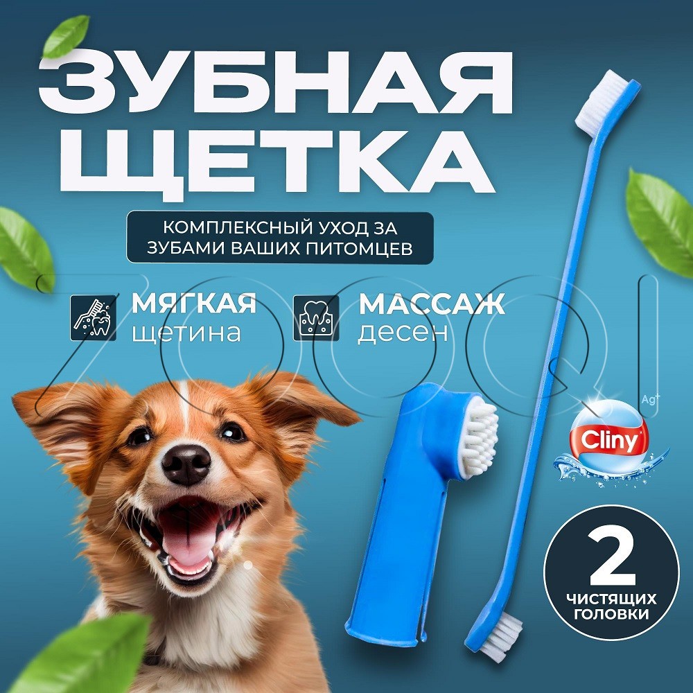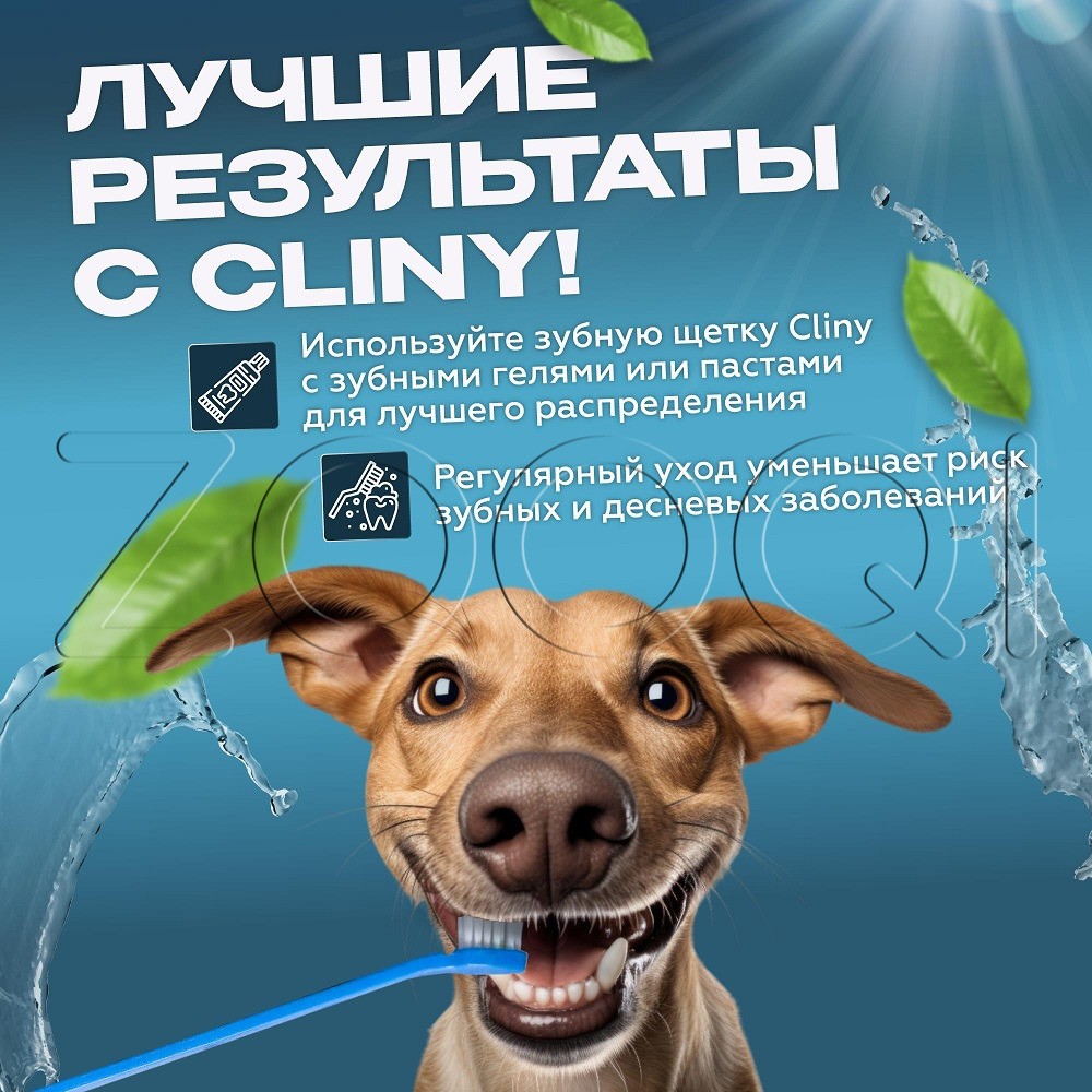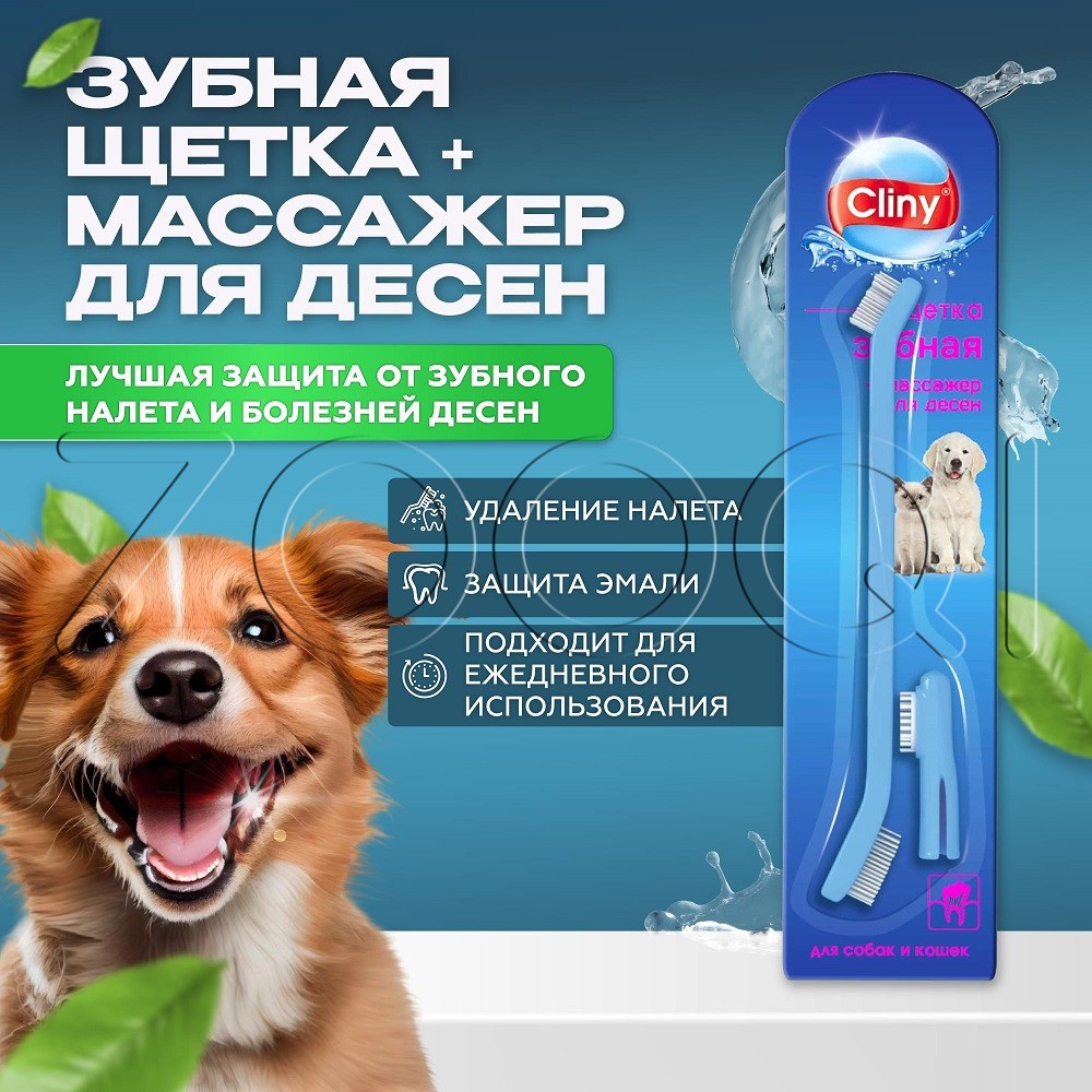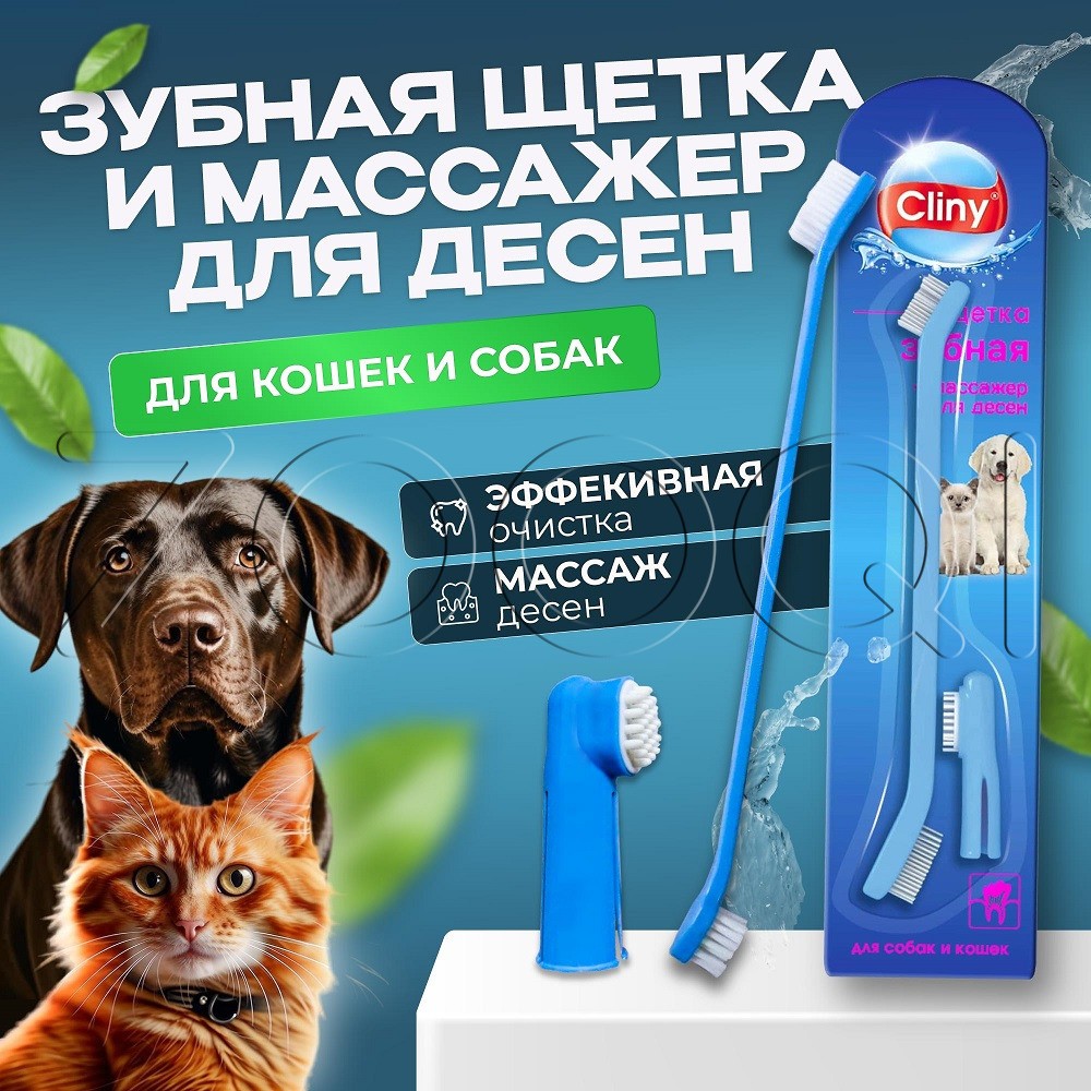 Cliny Набор для ухода за зубами собак и кошек. Двусторонняя зубная щетка благодаря различному размеру чистящих головок обеспечит удобный уход за зубами как крупных, так и мелких собак и кошек. Массажная щеточка-наперсток из силикона позволит провести массаж десен.
