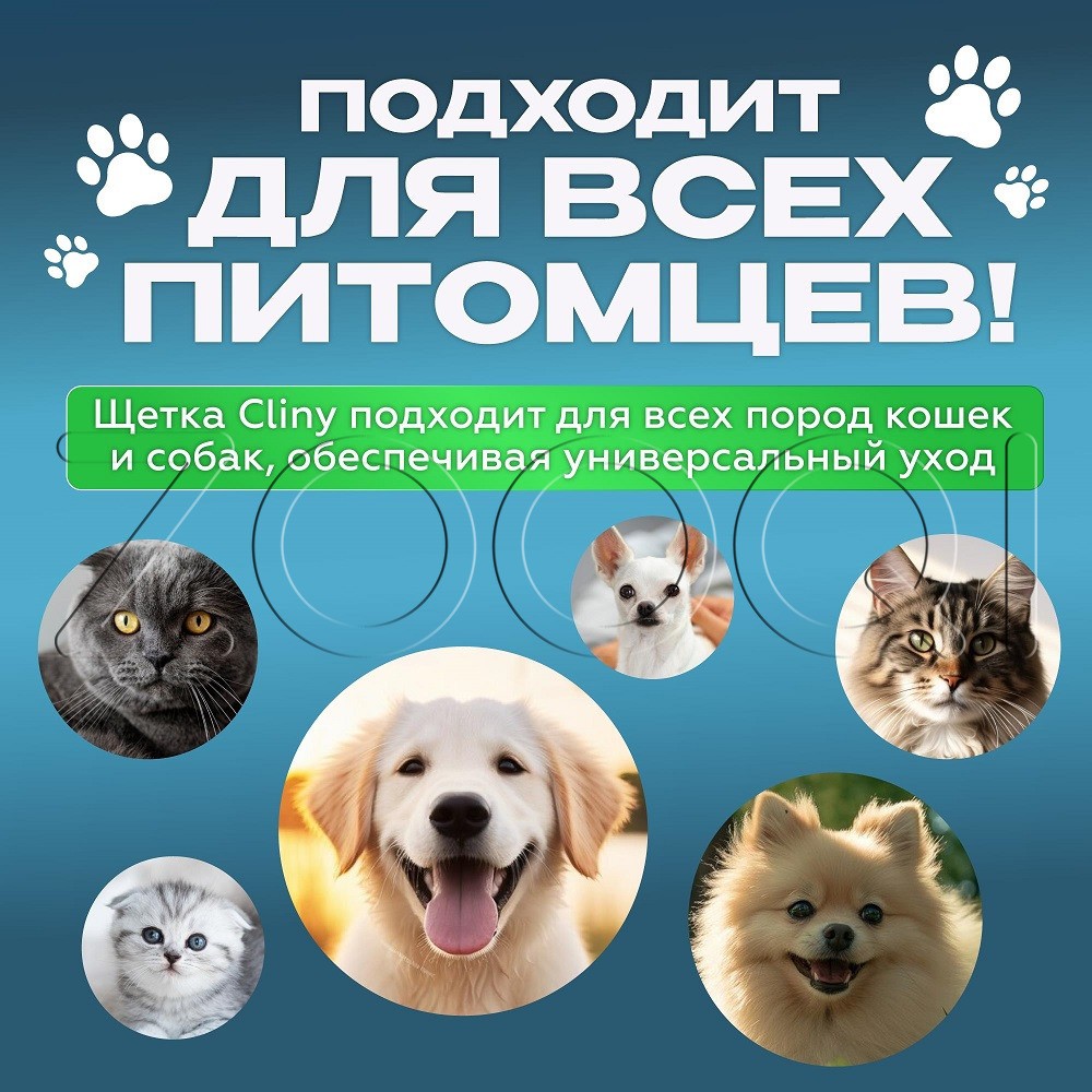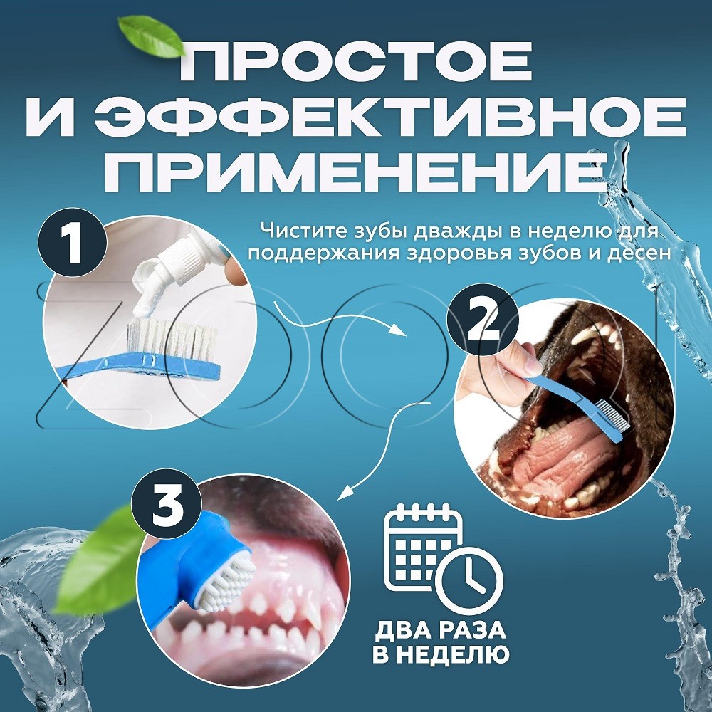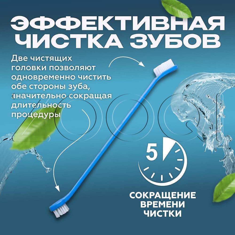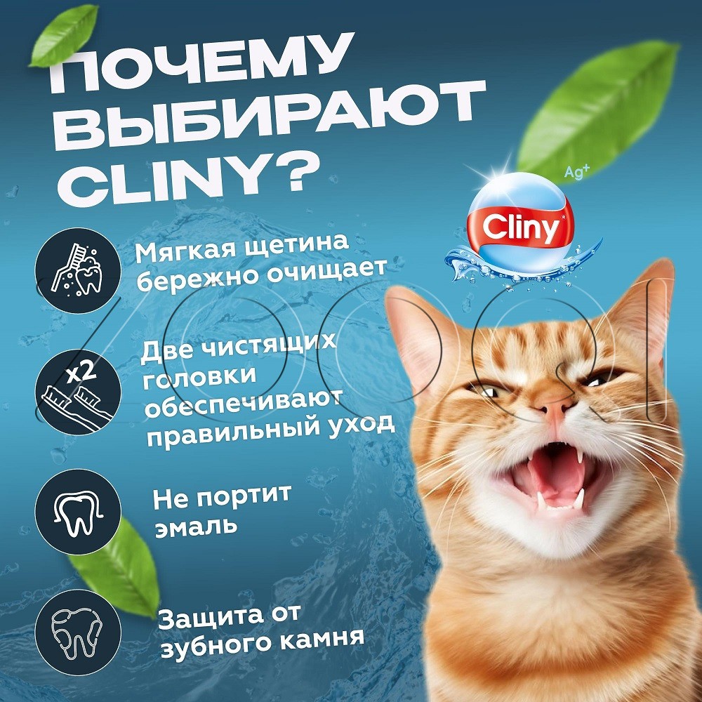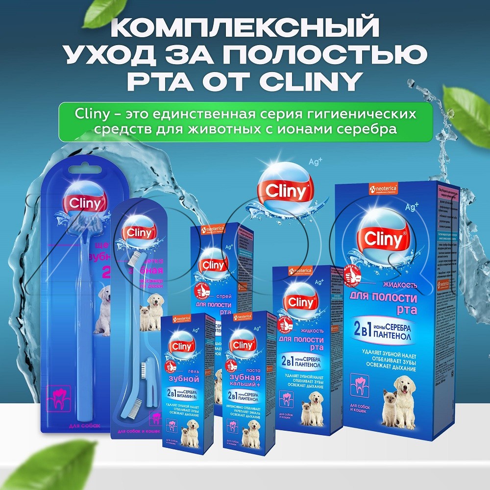 Cliny Набор для ухода за зубами собак и кошек. Двусторонняя зубная щетка благодаря различному размеру чистящих головок обеспечит удобный уход за зубами как крупных, так и мелких собак и кошек. Массажная щеточка-наперсток из силикона позволит провести массаж десен.