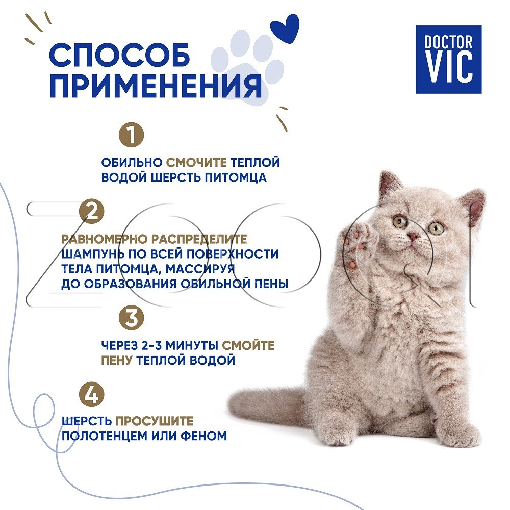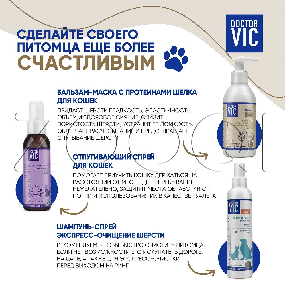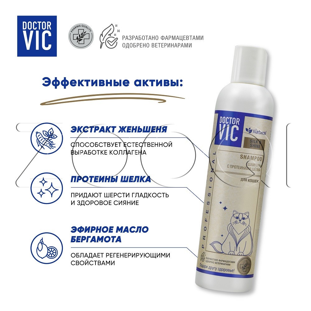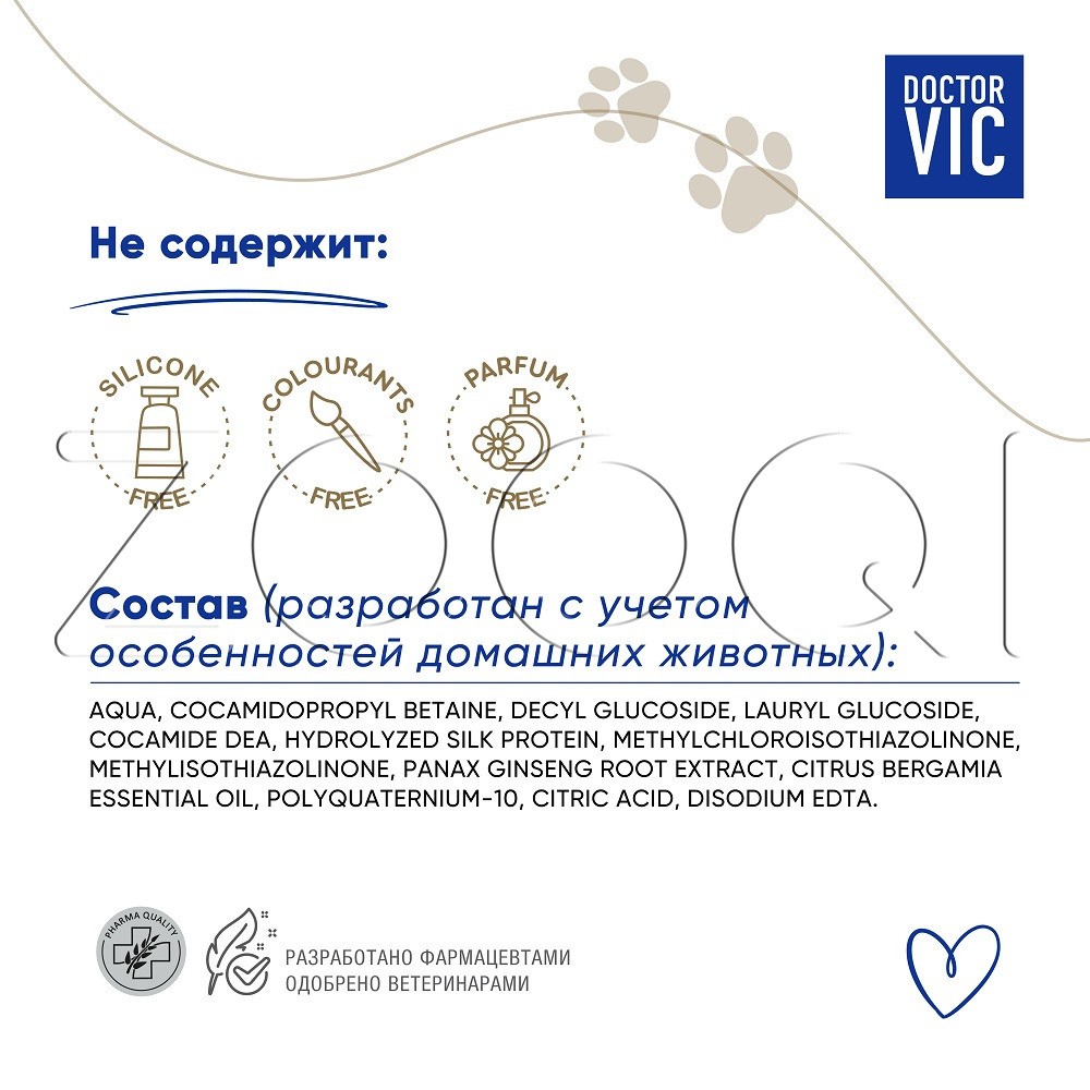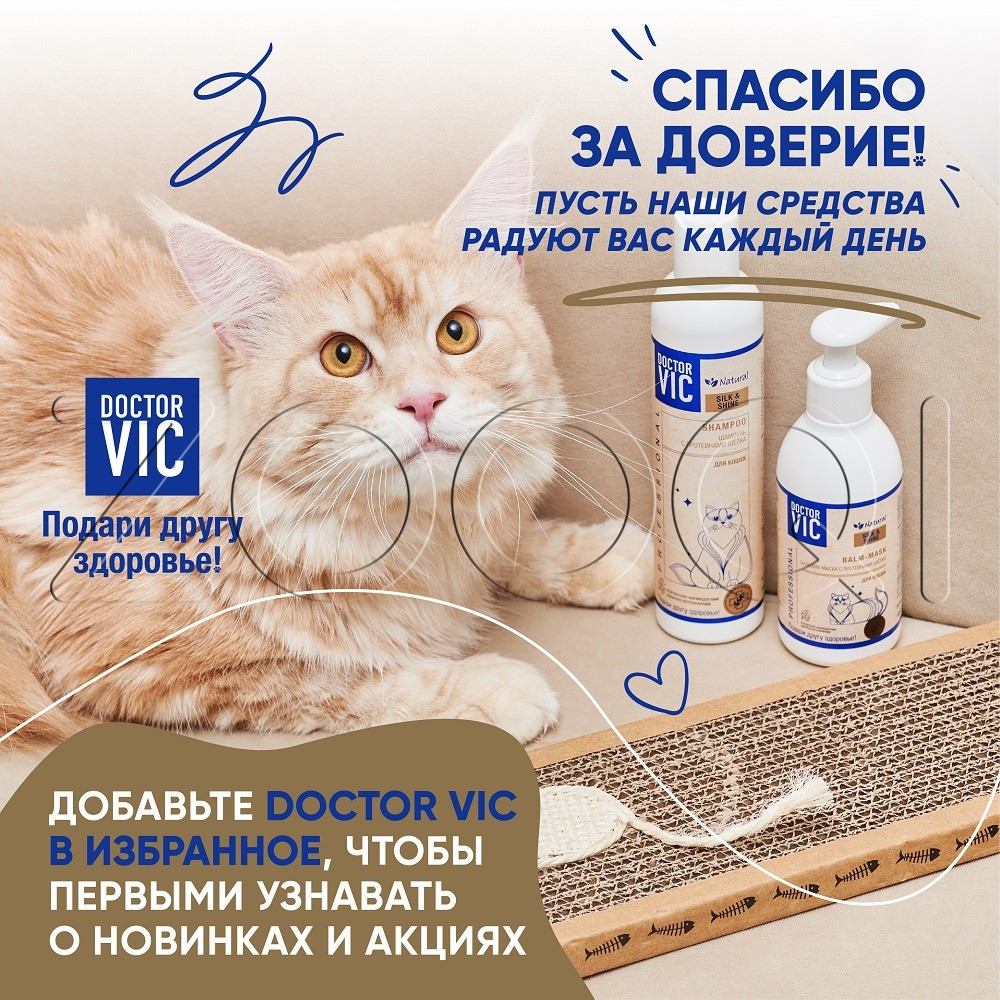 Серия DOCTOR VIC с протеинами шёлка, натуральным экстрактом женьшеня и эфирным маслом бергамота, помогает достигнуть шелковистой структуры шерсти, придаёт ей потрясающую гладкость, объём и здоровое сияние. Серия благотворно влияет на состояние кожи и шерсти животных. Идеально подходит для декоративных и выставочных пород кошек.