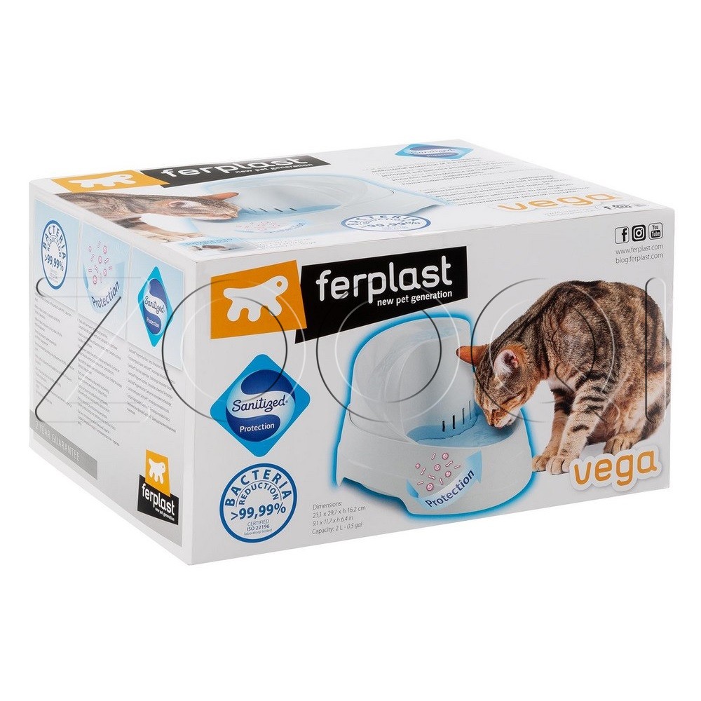 Ferplast Vega – поилка с защитой от бактерий Sanitized для кошек и мелких собак. Ее особенность заключается в непрерывном потоке воды, имитирующем настоящий водопад. Оснащена ручкой для удобного перемещения, практичными антискользящими ножками для прочной фиксации.