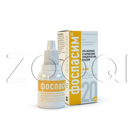 Фоспасим Раствор для перорального применения (Fospasim oral solution) назначают собакам, кошкам и декоративным грызунам при неврозах, повышенной возбудимости, поведенческих расстройствах, фобиях (боязнь шумов и взрывов — салютов, фейерверков, грозы, выстрелов и т. д.), стрессе (расставание с хозяином, раннее отлучение молодняка от матери, перегруппировка, транспортировка), для повышения адаптационных способностей организма, оптимизации процесса дрессировки, при синдроме хронической усталости у служебных собак.
