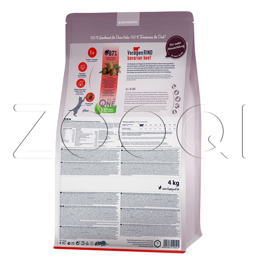 Happy Cat Sterilised Voralpen Rind (Beef) – полнорационный сухой корм с говядиной для стерилизованных кошек и кастрированных котов всех пород.