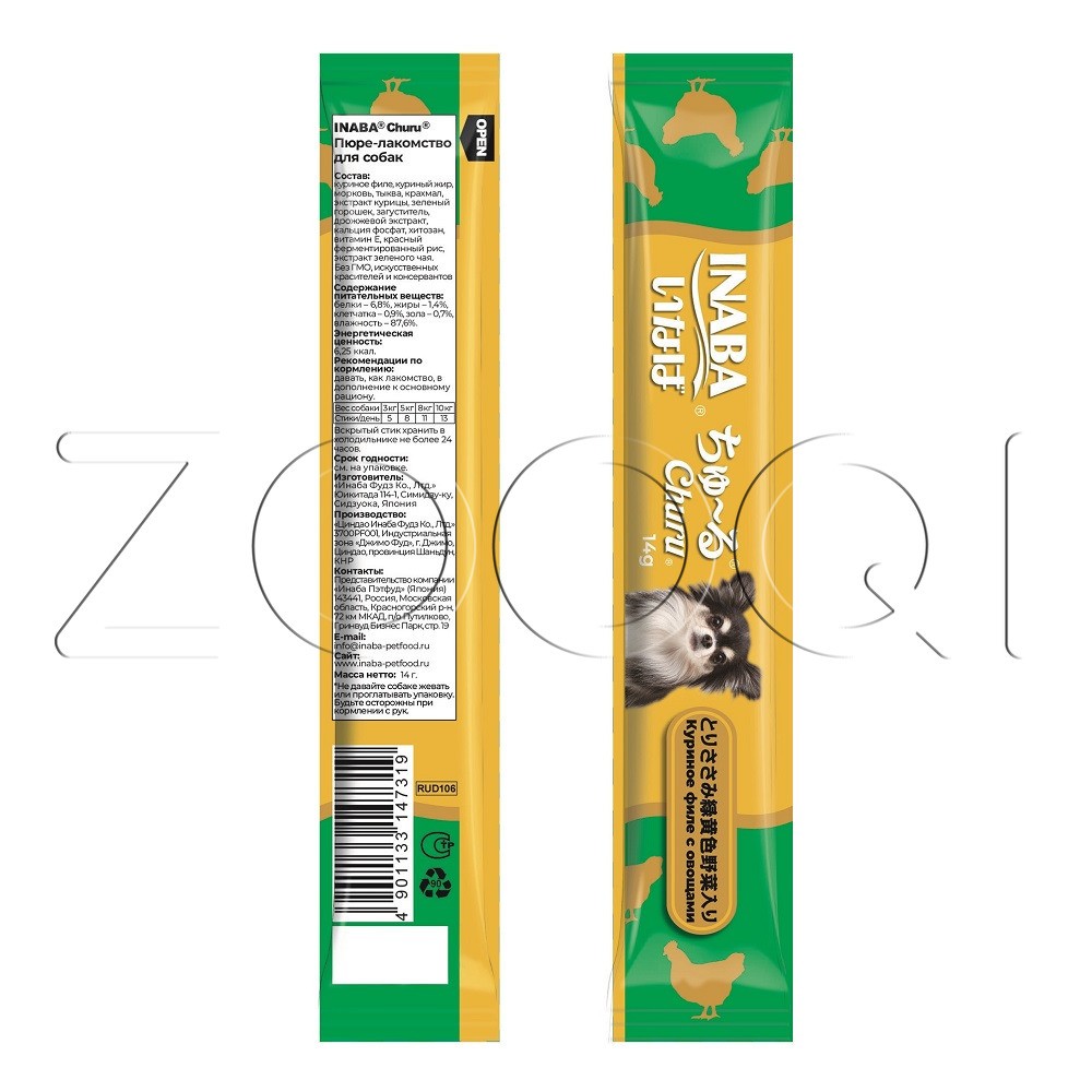 INABA Churu (Чуру) – супер-премиальное пюре-лакомство для собак на основе кусочков нежного филе фермерской курицы с овощами от японского производителя INABA изготовлено исключительно из натуральных полезных ингредиентов и отличается высоким процентом влажности, благодаря чему поддерживается водный баланс организма собаки. Кремовая текстура, напоминяющая пюре или суп, подойдет даже самым привередливым собакам или собакам с чувствительным пищеварением.