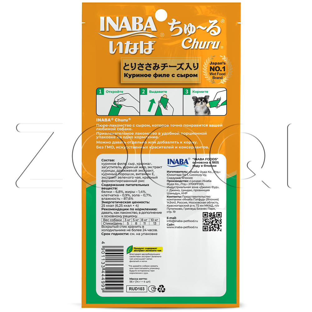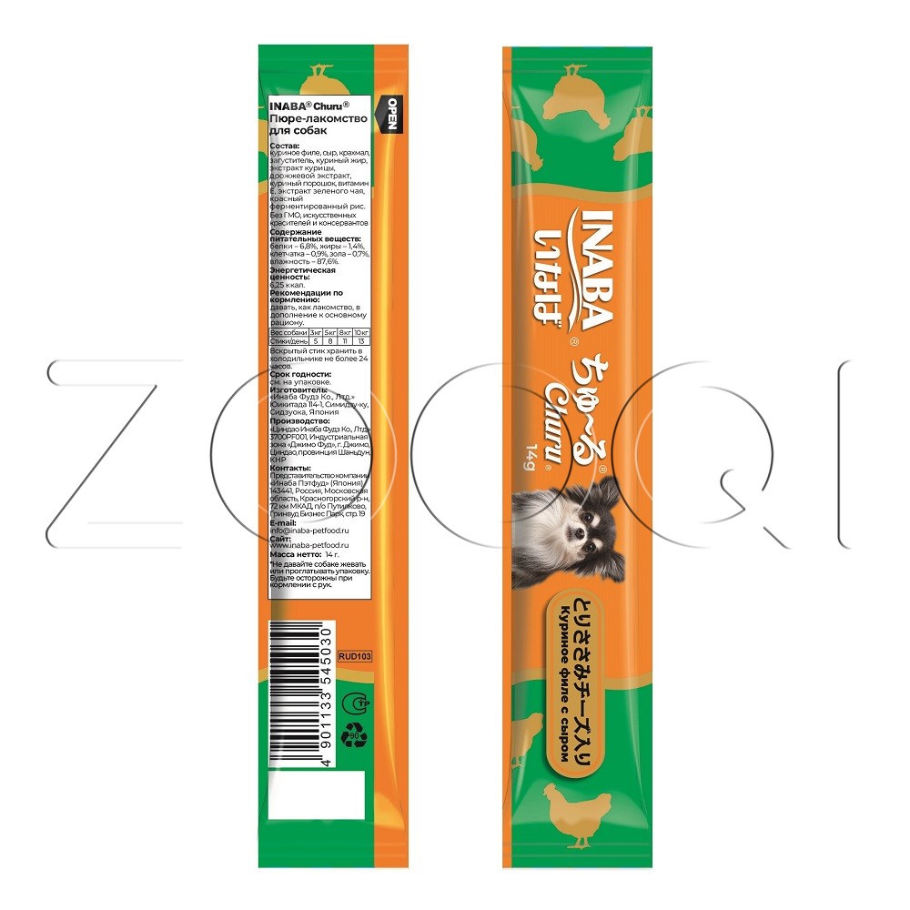 INABA Churu (Чуру) – cупер-премиальное пюре-лакомство для собак на основе кусочков нежного филе фермерской курицы с сыром от японского производителя INABA изготовлено исключительно из натуральных полезных ингредиентов и отличается высоким процентом влажности, благодаря чему поддерживается водный баланс организма собаки. Кремовая текстура, напоминяющая пюре или суп, подойдет даже самым привередливым собакам или собакам с чувствительным пищеварением.