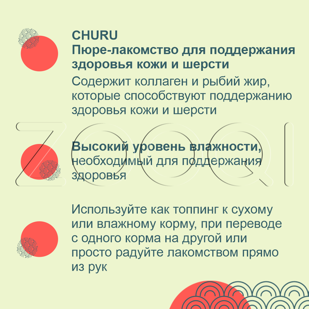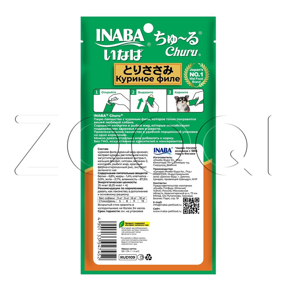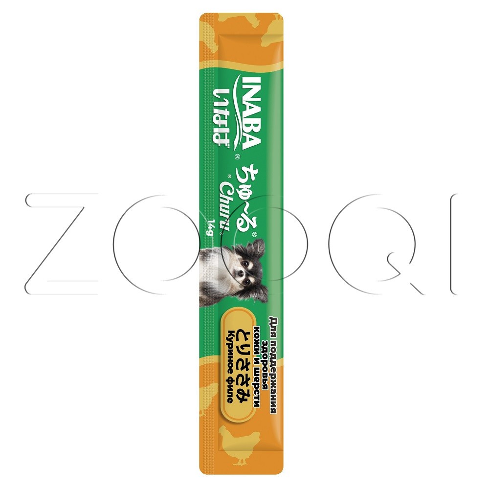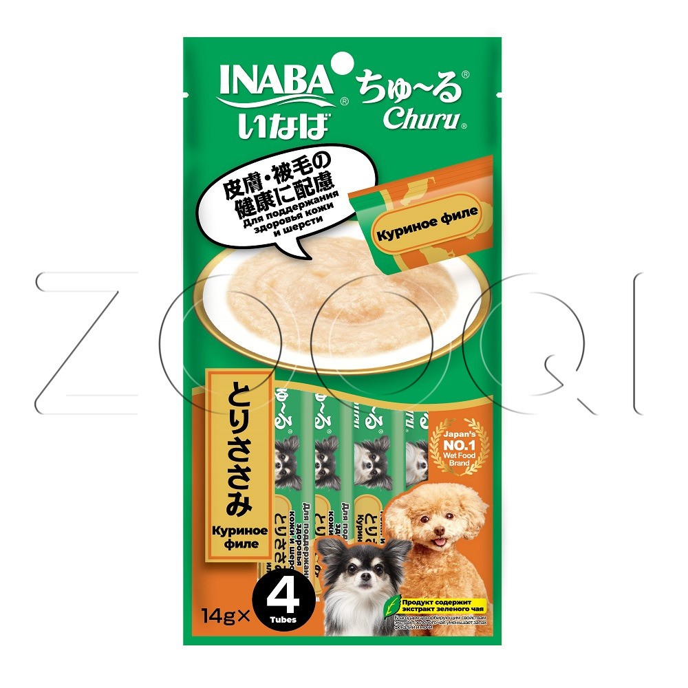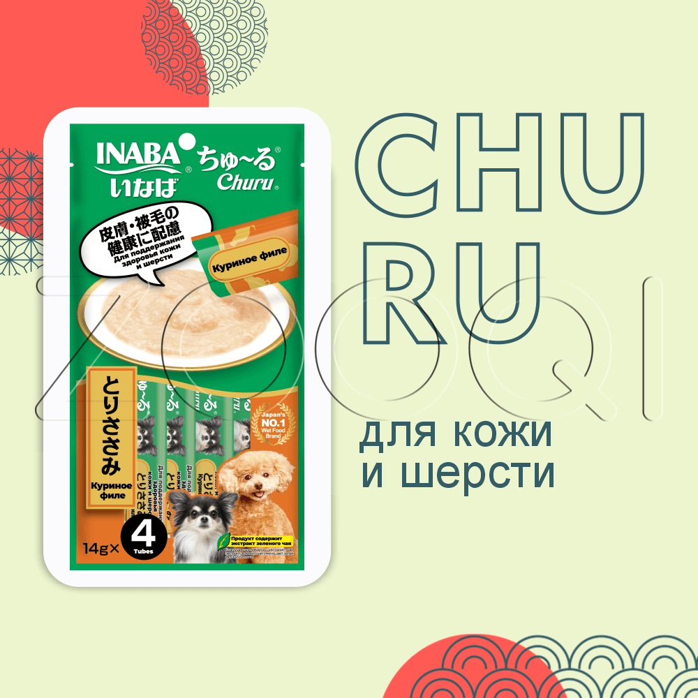 INABA Churu (Чуру) – супер-премиальное функциональное пюре-лакомство для собак на основе кусочков нежного филе фермерской курицы от японского производителя INABA, изготовлено исключительно из натуральных полезных ингредиентов и отличается высоким процентом влажности, благодаря чему поддерживается водный баланс организма собаки. Кремовая текстура, напоминяющая пюре или суп, подойдет даже самым привередливым собакам или собакам с чувствительным пищеварением. Содержит в составе коллаген и рыбий жир, которые способствуют поддержанию красоты и здоровья кожи и шерсти.