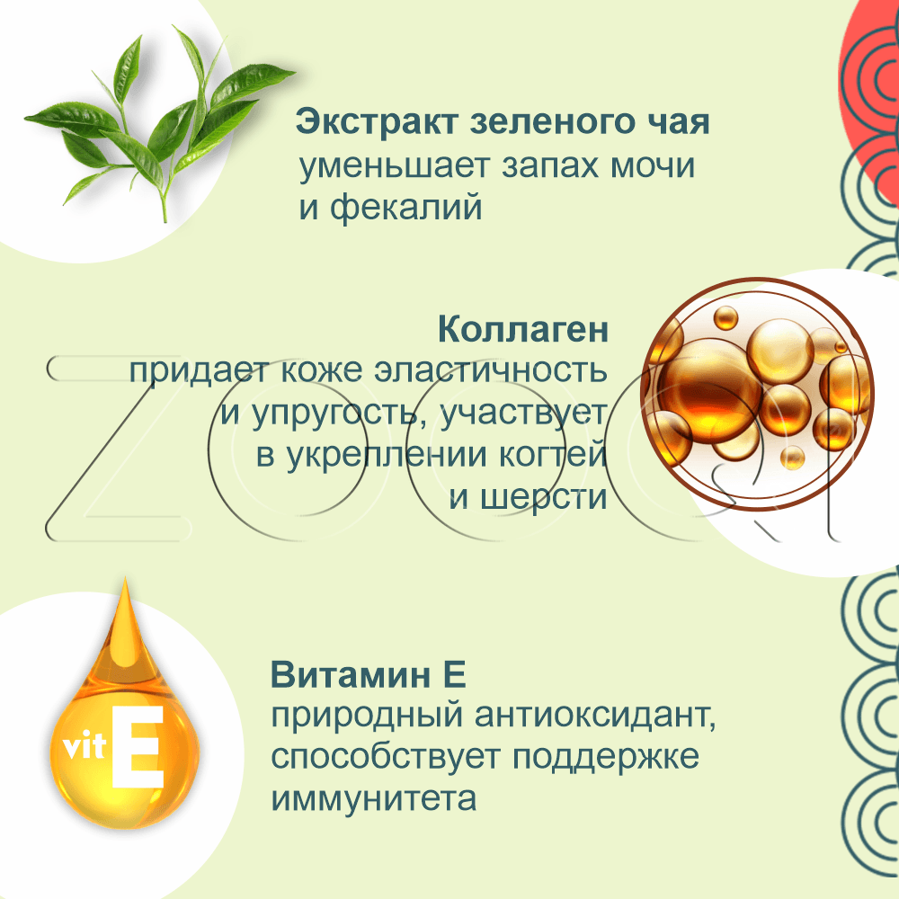 Во все продукты добавлен экстракт зелёного чая, который, благодаря содержанию катехина, нейтрализует неприятные запахи содержимого кишечника.