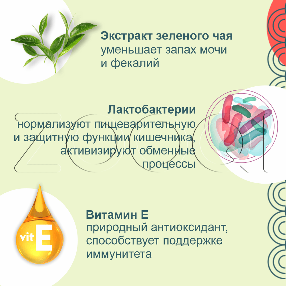 Во все продукты добавлен экстракт зелёного чая, который, благодаря содержанию катехина, нейтрализует неприятные запахи содержимого кишечника.