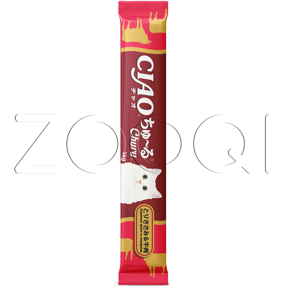 INABA CIAO Churu (Чао Чуру) – супер-премиальное пюре-лакомство для кошек на основе кусочков нежного филе фермерской курицы с говядиной от японского производителя INABA, изготовлено исключительно из натуральных полезных ингредиентов и отличается высоким процентом влажности, благодаря чему поддерживается водный баланс организма кошки. Кремовая текстура, напоминяющая пюре или суп, подойдет даже самым привередливым кошкам и котам или кошкам с чувствительным пищеварением.