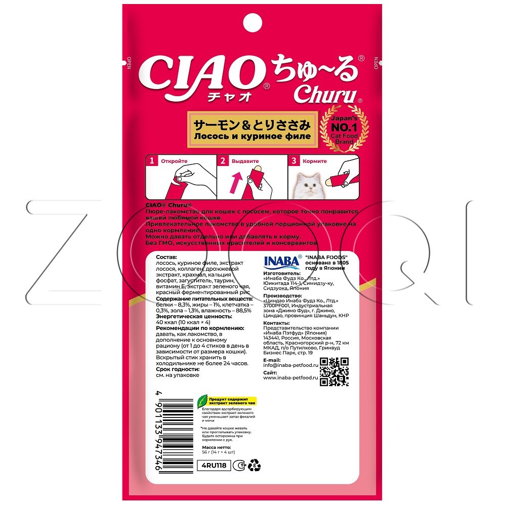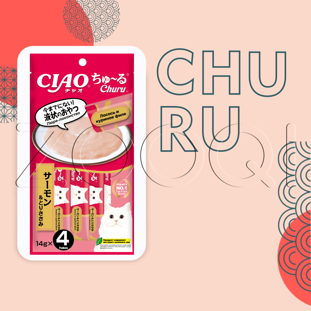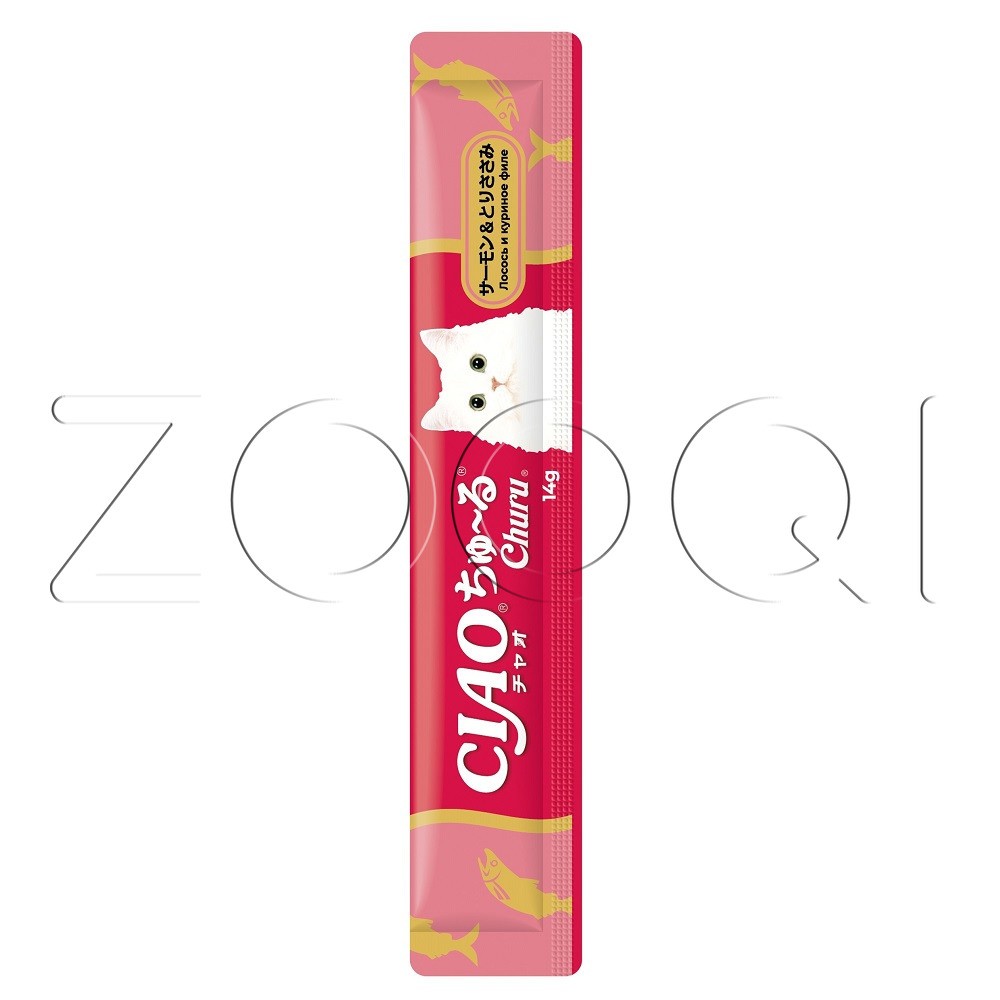 INABA CIAO Churu (Чао Чуру) – супер-премиальное пюре-лакомство для кошек на основе кусочков мяса лосося и нежного филе фермерской курицы от японского производителя INABA, изготовлено исключительно из натуральных полезных ингредиентов и отличается высоким процентом влажности, благодаря чему поддерживается водный баланс организма кошки. Кремовая текстура, напоминяющая пюре или суп, подойдет даже самым привередливым кошкам и котам или кошкам с чувствительным пищеварением.