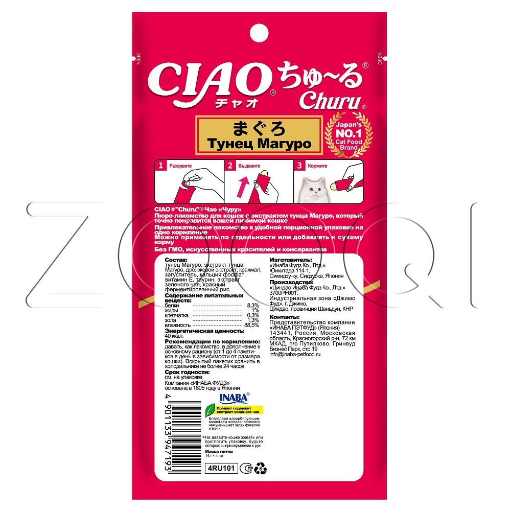 INABA CIAO Churu (Чао Чуру) – супер-премиальное пюре-лакомство для кошек на основе кусочков мяса глубоководного тунца Магуро от японского производителя INABA, изготовлено исключительно из натуральных полезных ингредиентов и отличается высоким процентом влажности, благодаря чему поддерживается водный баланс организма кошки. Кремовая текстура, напоминяющая пюре или суп, подойдет даже самым привередливым кошкам и котам или кошкам с чувствительным пищеварением.