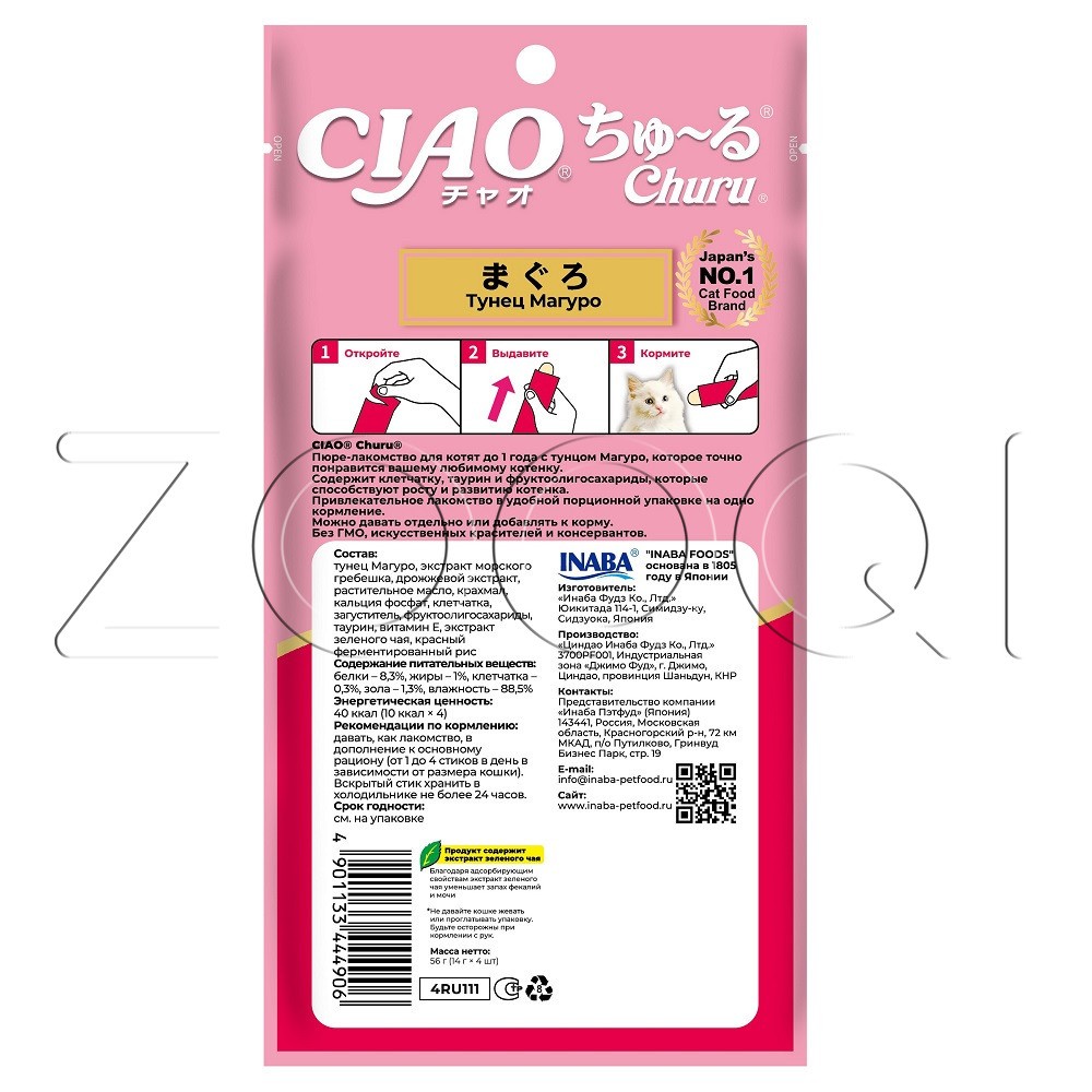 INABA CIAO Churu (Чао Чуру) – супер-премиальное пюре-лакомство для котят на основе кусочков мяса глубоководного тунца Магуро от японского производителя INABA, изготовлено исключительно из натуральных полезных ингредиентов и отличается высоким процентом влажности, благодаря чему поддерживается водный баланс организма котенка. Кремовая текстура, напоминяющая пюре или суп, подойдет даже самым привередливым котятам или малышам с чувствительным пищеварением.