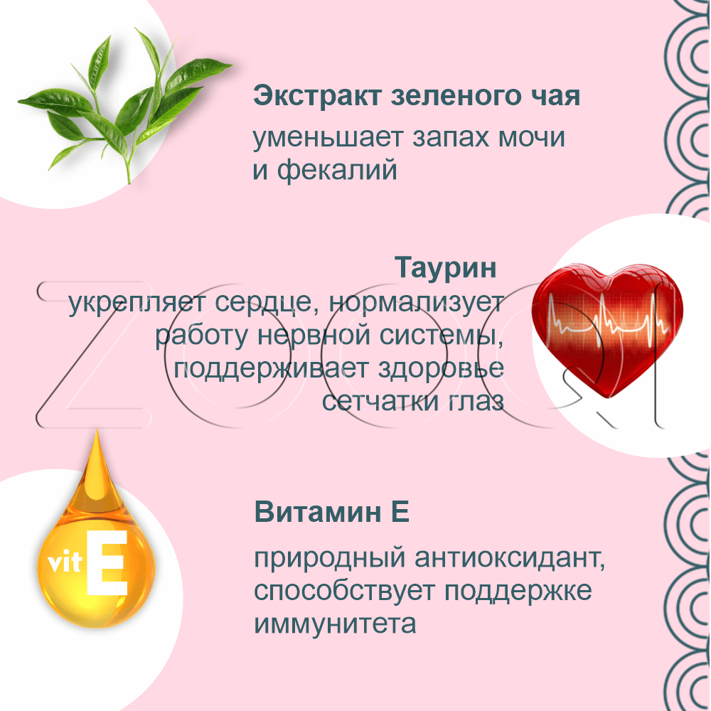 Во все продукты добавлен экстракт зелёного чая, который, благодаря содержанию катехина, нейтрализует неприятные запахи содержимого кишечника.