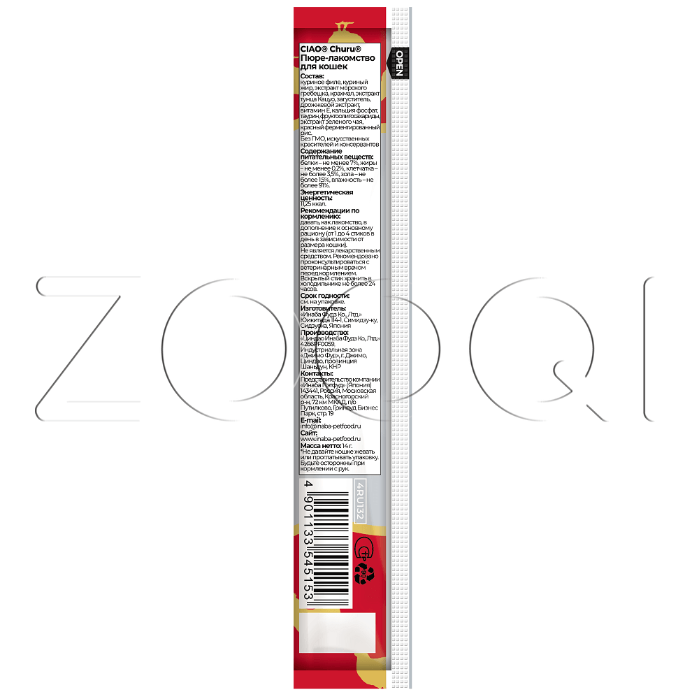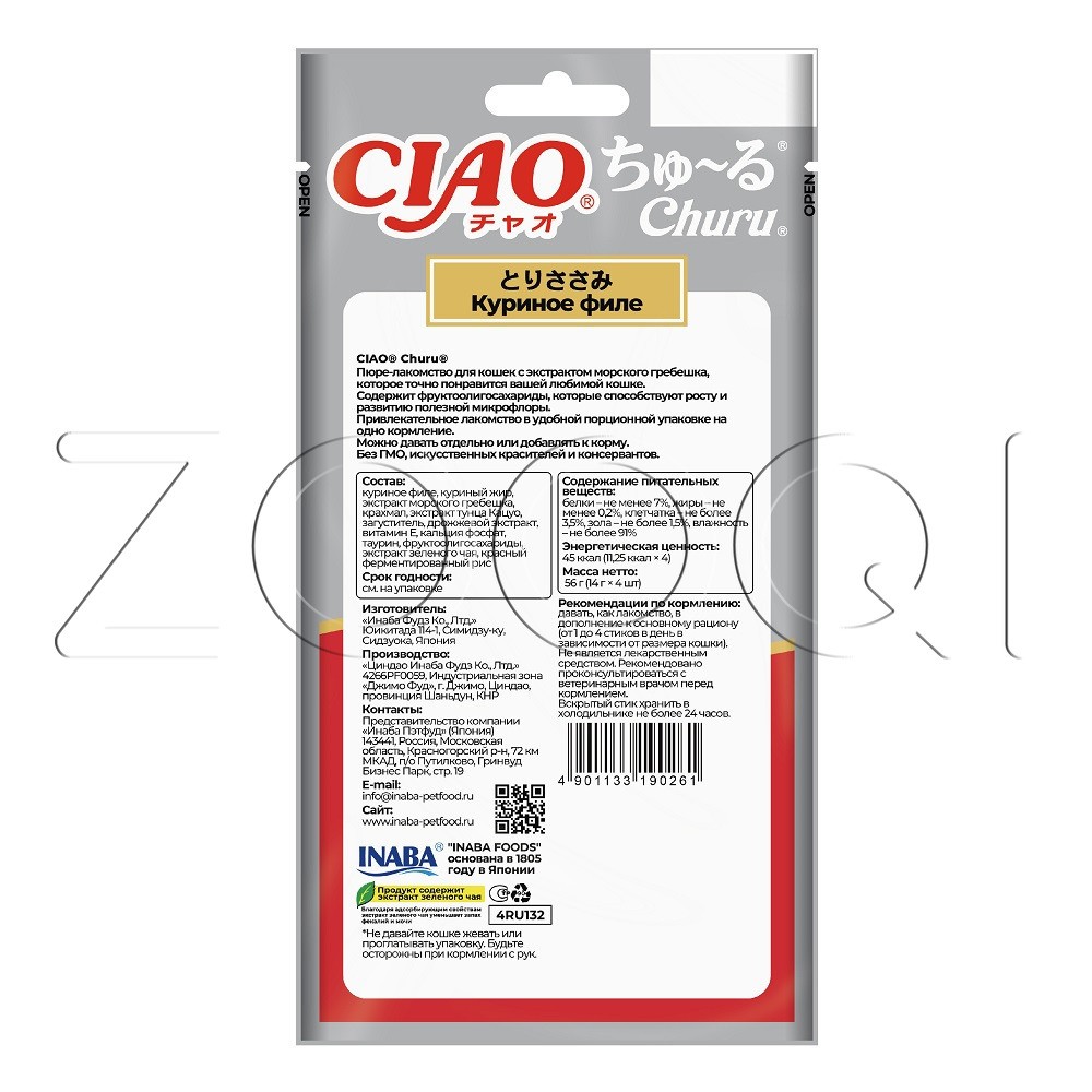 INABA CIAO Churu (ЧАО Чуру) – супер-премиальное функциональное пюре-лакомство для поддержания здоровья ЖКТ у кошек. Изготавливается на основе куриного филе с добавлением экстракта морского гребешка для увеличения вкусовой привлекательности.