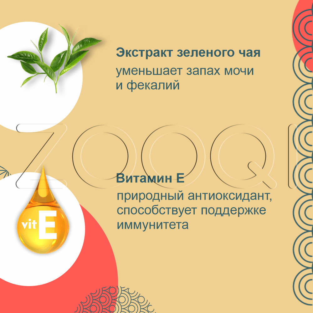 Во все продукты добавлен экстракт зелёного чая, который, благодаря содержанию катехина, нейтрализует неприятные запахи содержимого кишечника.