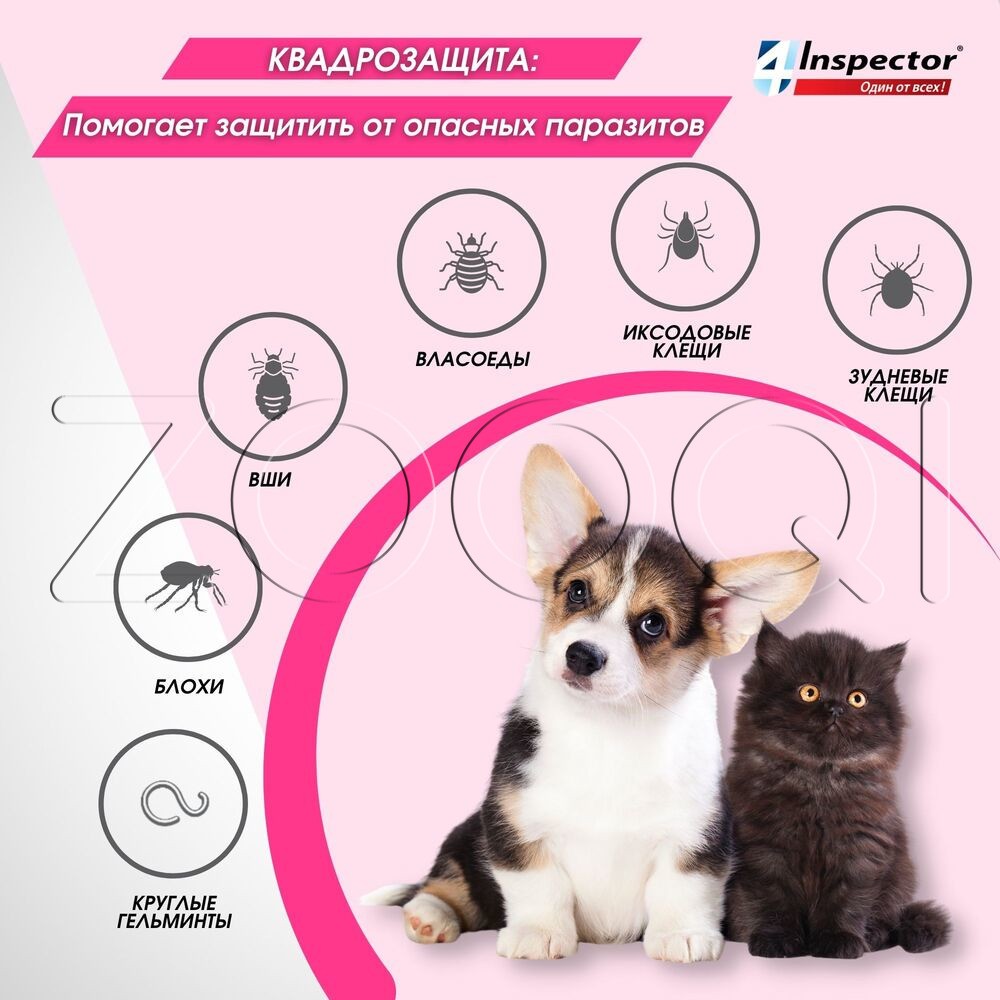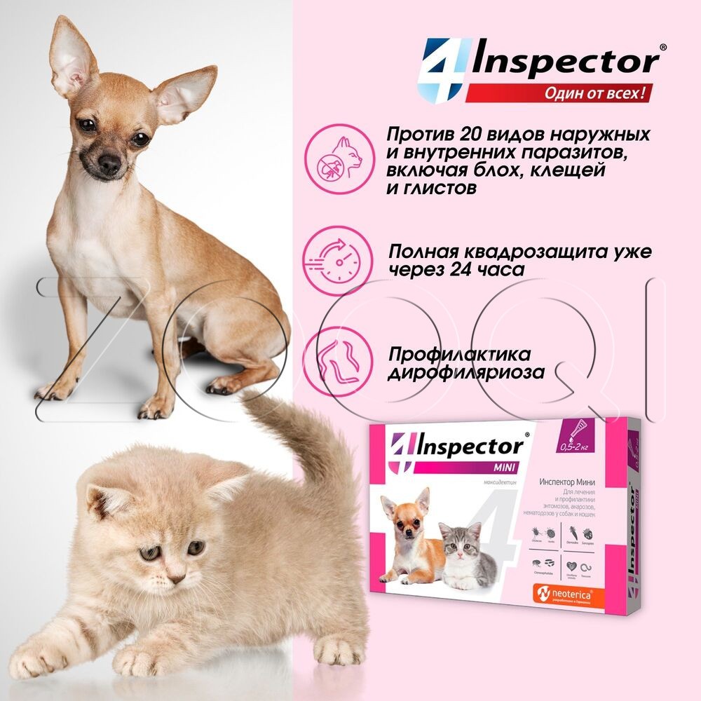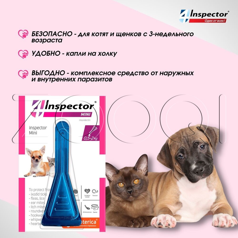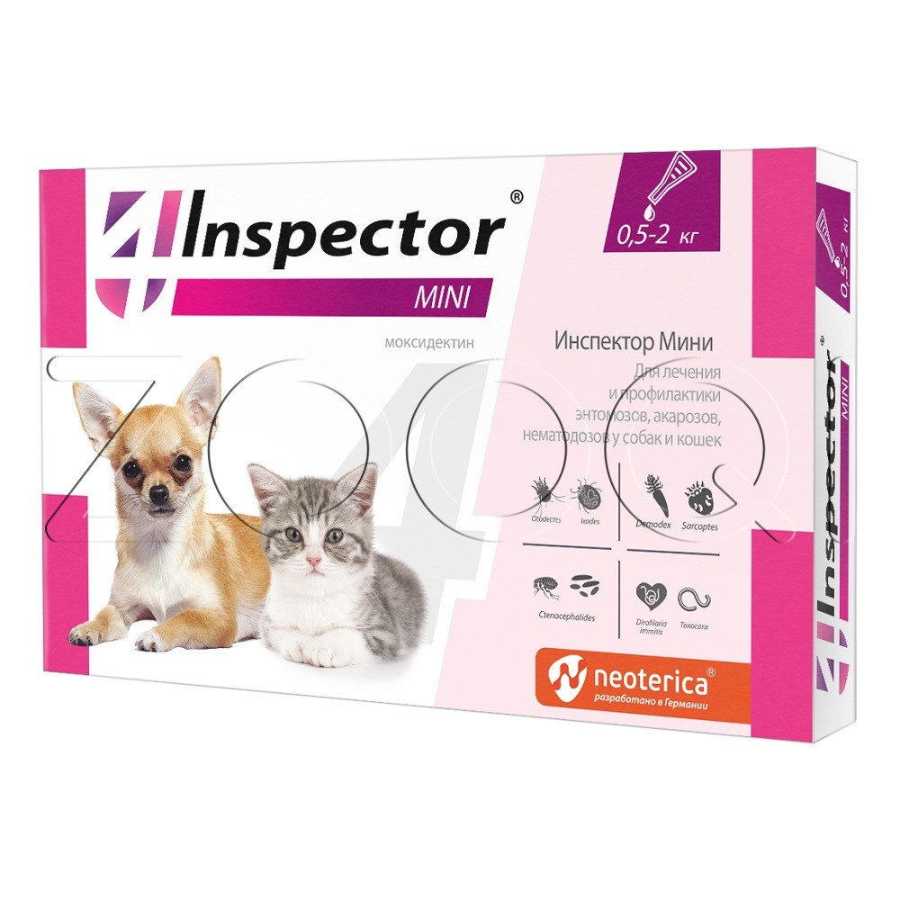 Инспектор Мини (Inspector Mini) – комплексный препарат от внешних и внутренних паразитов. Назначают котятам, щенкам, а также собакам и кошкам мелких пород для лечения и профилактики энтомозов (блохи, вши, власоеды), акарозов (иксодидозы, отодектоз, нотоэдроз, саркоптоз, демодекоз) и нематодозов желудочнокишечного тракта (токсокароз, токсаскаридоз, унцинариоз, анкилостомоз, трихоцефалез), а также в целях профилактики дирофиляриоза.