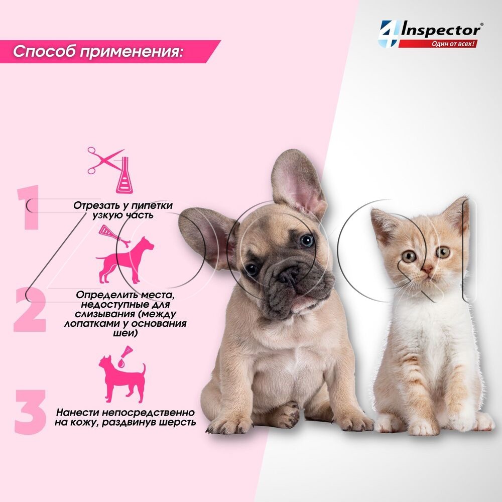 Инспектор Мини назначают котятам, щенкам, а также собакам и кошкам мелких пород для лечения и профилактики энтомозов (блохи, вши, власоеды), акарозов (иксодидозы, отодектоз, нотоэдроз, саркоптоз, демодекоз) и нематодозов желудочнокишечного тракта (токсокароз, токсаскаридоз, унцинариоз, анкилостомоз, трихоцефалез), а также в целях профилактики дирофиляриоза.