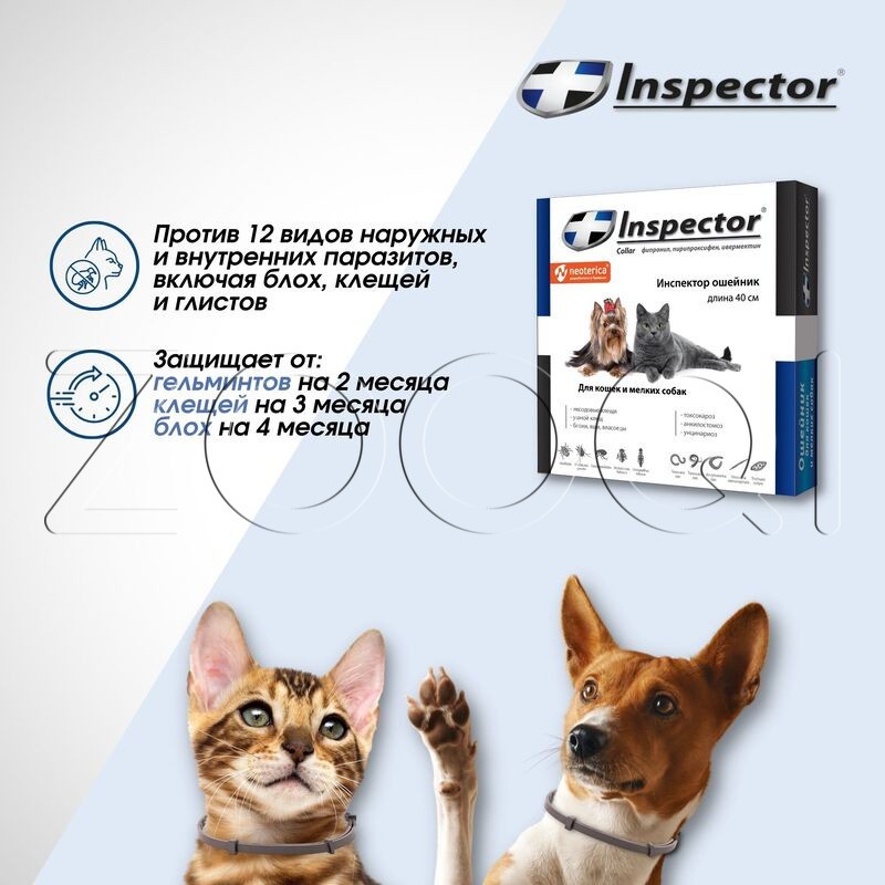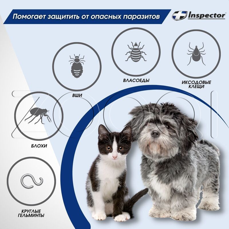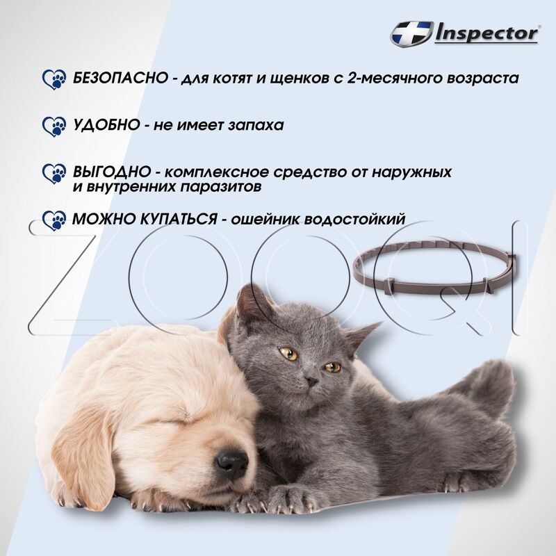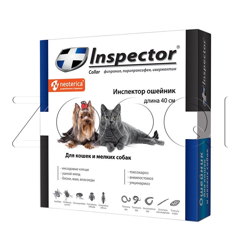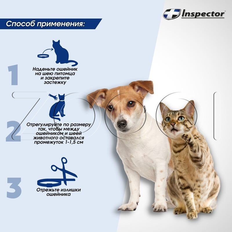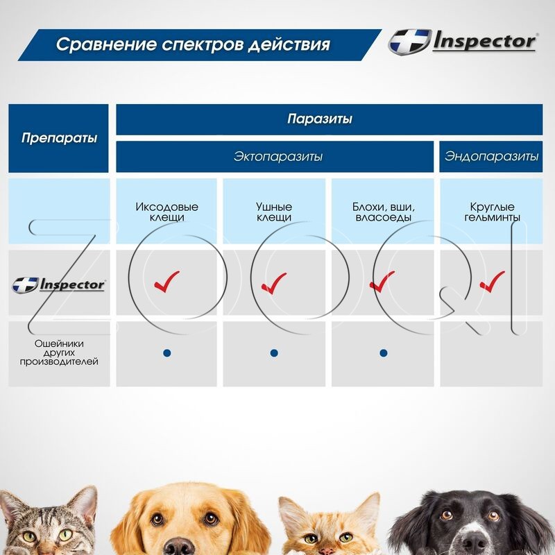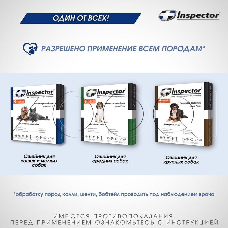 Инспектор (Inspector) ошейник применяют собакам и кошкам для лечения и профилактики энтомозов, отодектоза, поражении иксодовыми клещами, а также в целях лечения и профилактики нематодозов желудочно-кишечного тракта.