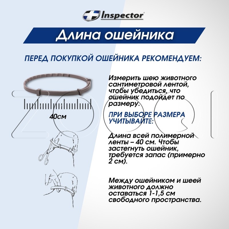Ошейник Инспектор выпускают для крупных собак длиной 75 см, средних собак длиной 65 см, для кошек, маленьких собак, щенков и котят длиной 40 см в индивидуальных герметично закрытых пакетах из материала комбинированного на основе алюминиевой фольги, помещенных поштучно в картонные пачки вместе с инструкцией по применению.