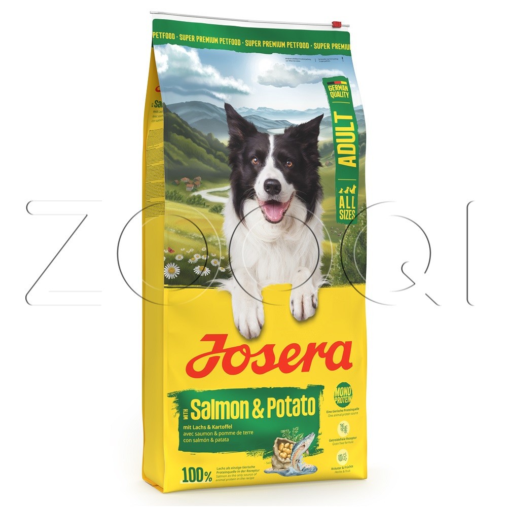 Josera Adult with Salmon & Potato (All Sizes 22/14) – беззерновой, монопротеиновый рацион с лососем, картофелем, травами и фруктами для взрослых собак с чувствительным пищеварением.