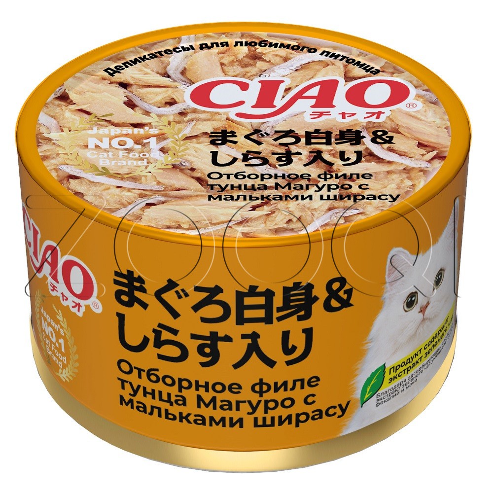 INABA CIAO Сan (ЧАО Кэн) – супер-премиальный влажный корм для кошек от японского производителя INABA приготовлен на основе кусочков мяса глубоководного тунца Магуро с имальками ширасу. Внутри упаковки ароматные нежные волокна в желе, которые подойдут даже самым привередливым кошкам и кошкам с чувствительным пищеварением.
