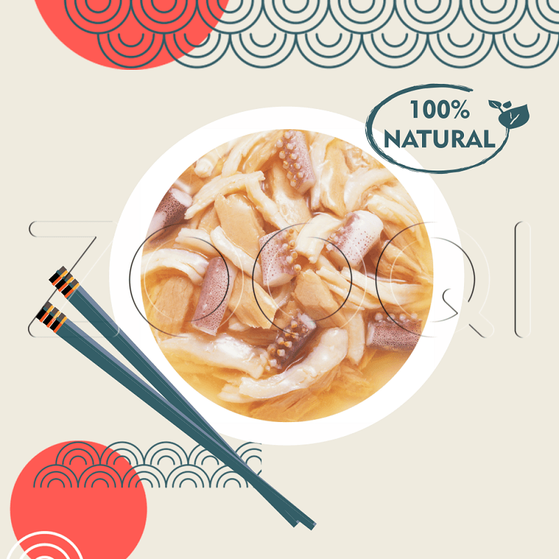 Куриное филе, тунец Магуро, кальмар, экстракт тунца Кацуо, крахмал, гидроли-зат протеина, загуститель, олигосахариды, витамин Е, экстракт зеленого чая, каротинои-ды, красный ферментированный рис.