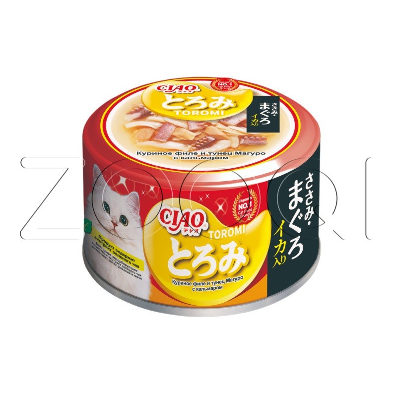 INABA CIAO Toromi (Чао Тороми) – супер-премиальный влажный корм для кошек от японского производителя INABA, приготовлен на основе нежного куриного филе, кусочков мяса тунца Кацуо с добавлением кальмара и насыщенного фирменного бульона. Внутри упаковки ароматные нежные волокна в бульоне-супе, которые подойдут даже самым привередливым кошкам и кошкам с чувствительным пищеварением.