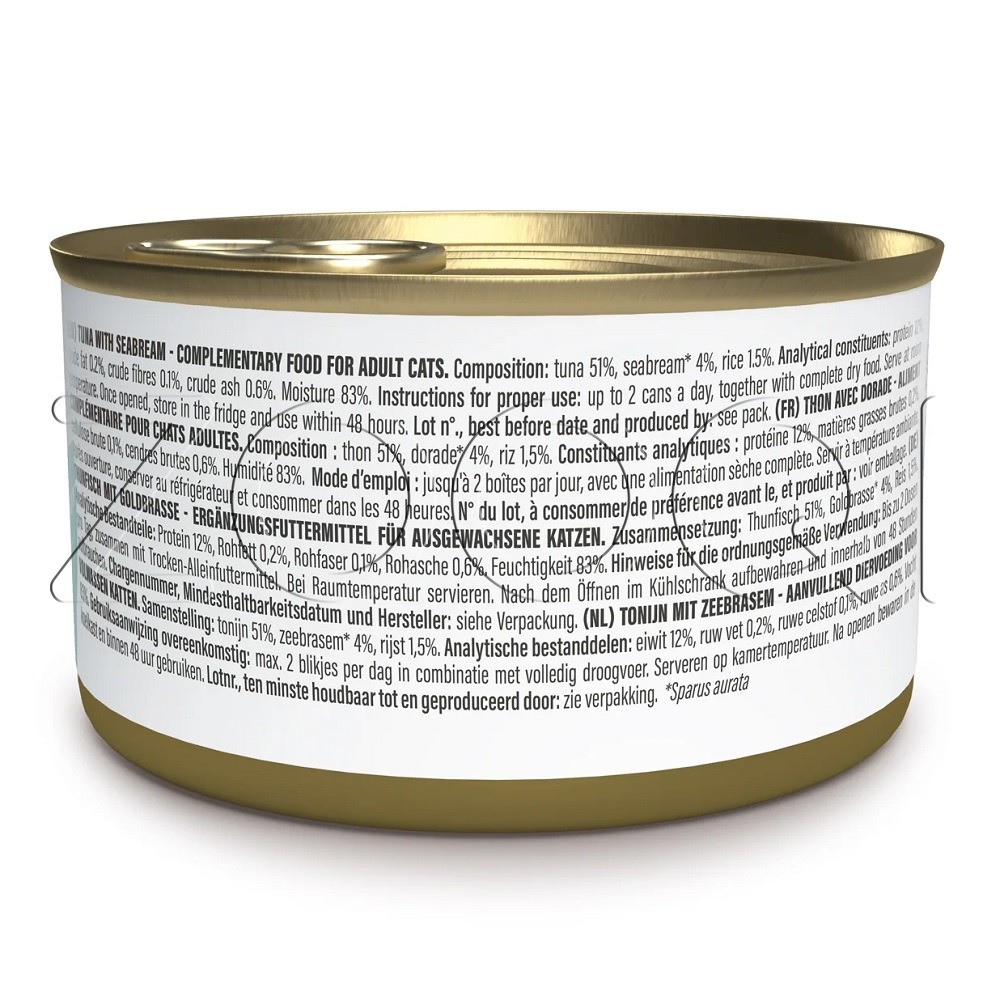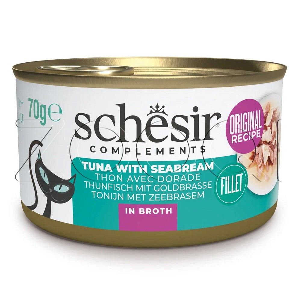 Schesir Cat Adult Tuna with Sea Bream in broth — дополнительный влажный корм с тунцом и морским лещом в бульоне для взрослых кошек.
